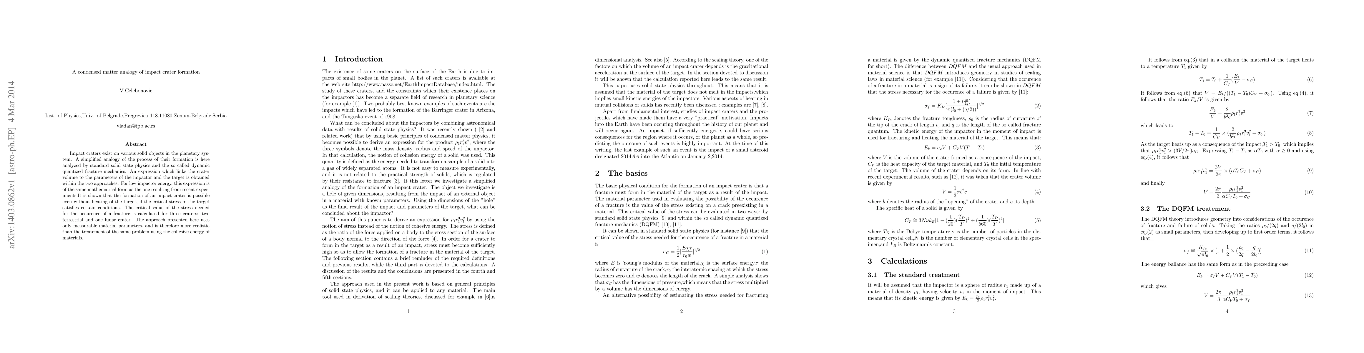 This paper uses solid state physics and dynamic quantized fracture mechanics to analyze the formation of impact craters, deriving a formula linking crater volume to impactor and target parameters. It demonstrates that crater formation can occur without heating, based on the critical stress conditions of the target material.