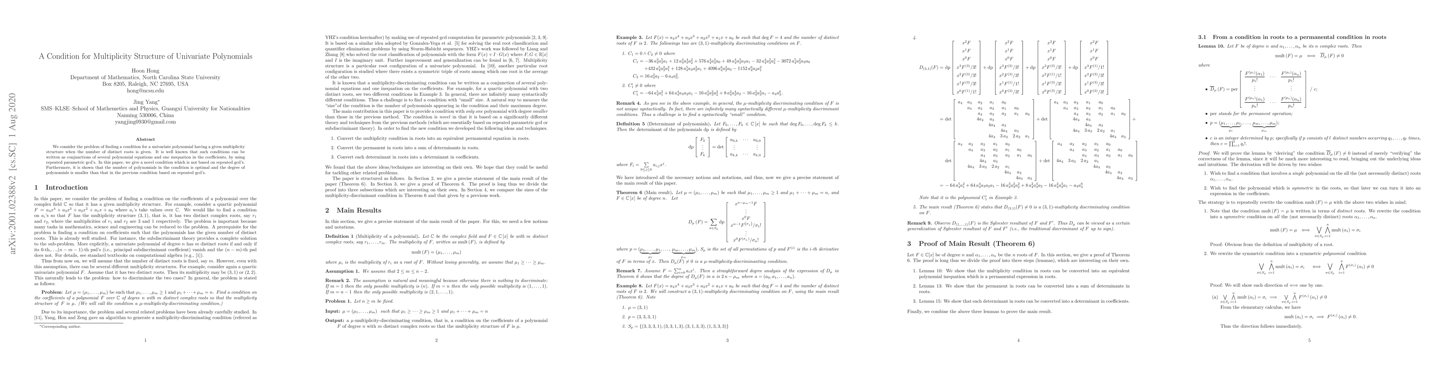 Researchers found a novel condition for univariate polynomials to have a given multiplicity structure without using repeated gcd's, with fewer and lower-degree polynomials than previous methods.