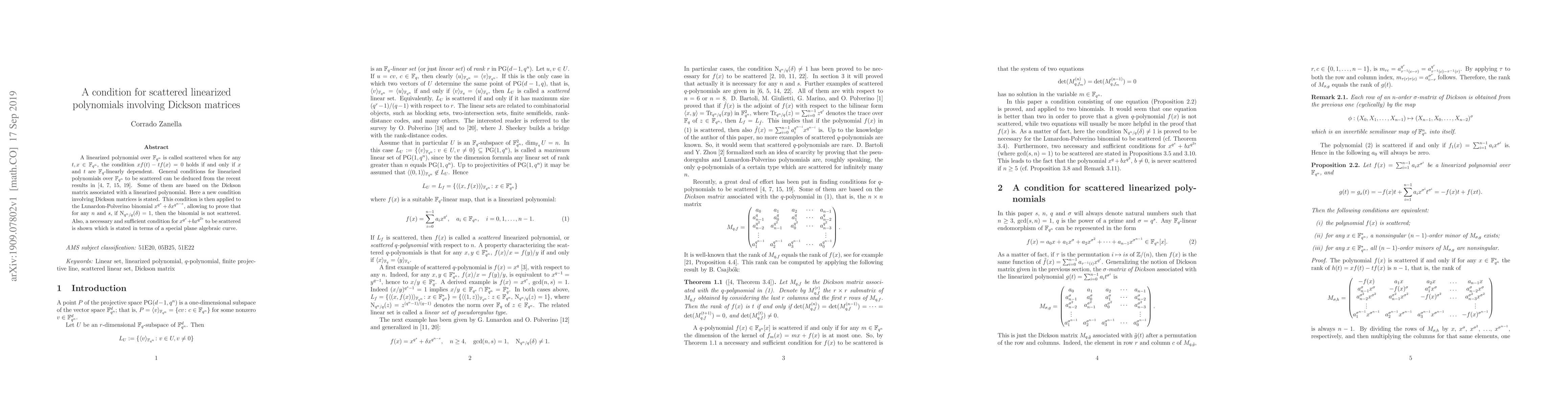 A linearized polynomial over $\mathbb F_{q^n}$ is called scattered when for any $t,x\in\mathbb F_{q^n}$, the condition $xf(t)-tf(x)=0$ holds if and only if $x$ and $t$ are $\mathbb F_q$-linearly dependent. General conditions for linearized polynomials over $\mathbb F_{q^n}$ to be scattered can be deduced from the recent results in [4,7,15,19]. Some of them are based on the Dickson matrix associated with a linearized polynomial. Here a new condition involving Dickson matrices is stated. This condition is then applied to the Lunardon-Polverino binomial $x^{q^s}+\delta x^{q^{n-s}}$, allowing to prove that for any $n$ and $s$, if $\mathbb N_{q^n/q}(\delta)=1$, then the binomial is not scattered. Also, a necessary and sufficient condition for $x^{q^s}+bx^{q^{2s}}$ to be scattered is shown which is stated in terms of a special plane algebraic curve.