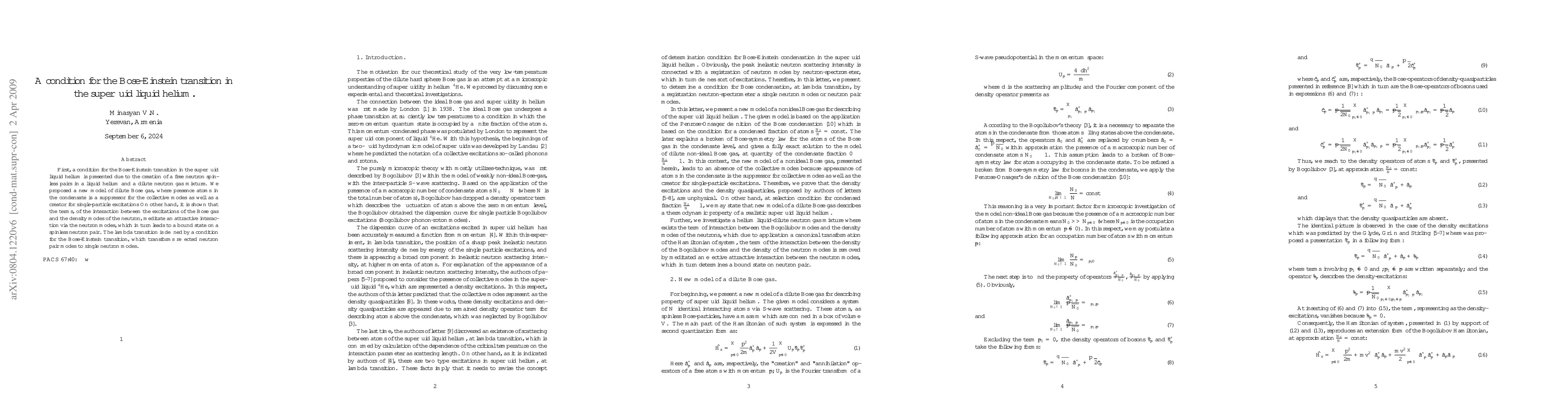This paper presents a new model for the Bose-Einstein transition in superfluid liquid helium, proposing that the presence of atoms in the condensate suppresses collective modes and creates single-particle excitations. It also introduces a condition for the lambda transition, where the interaction between neutron modes and Bose gas excitations leads to a bound state of spinless neutron pairs.