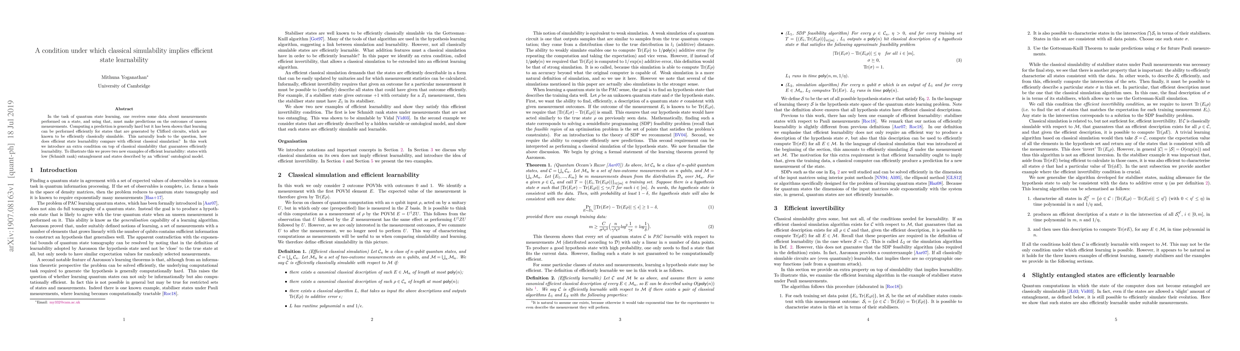 This paper explores the relationship between classical simulability and efficient state learnability in quantum mechanics, introducing a condition that ensures efficient learning when states are classically simulable. It demonstrates efficient learnability for states with low entanglement and those described by an efficient ontological model.
