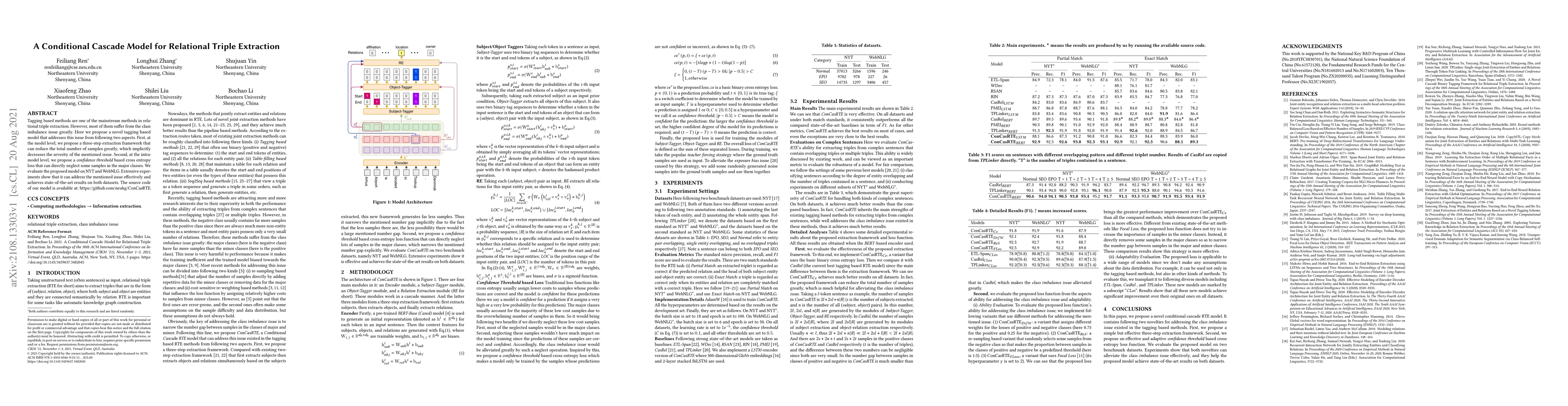 This paper proposes a novel tagging-based model for relational triple extraction that tackles class imbalance through a three-step extraction framework and a confidence threshold-based cross entropy loss, achieving state-of-the-art results on NYT and WebNLG datasets. The model's source code is publicly available.