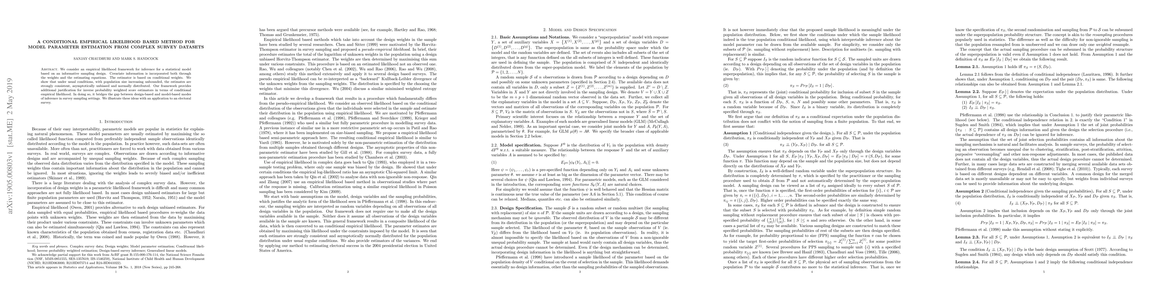 We consider an empirical likelihood framework for inference for a statistical model based on an informative sampling design. Covariate information is incorporated both through the weights and the estimating equations. The estimator is based on conditional weights. We show that under usual conditions, with population size increasing unbounded, the estimates are strongly consistent, asymptotically unbiased and normally distributed. Our framework provides additional justification for inverse probability weighted score estimators in terms of conditional empirical likelihood. In doing so, it bridges the gap between design-based and model-based modes of inference in survey sampling settings. We illustrate these ideas with an application to an electoral survey.