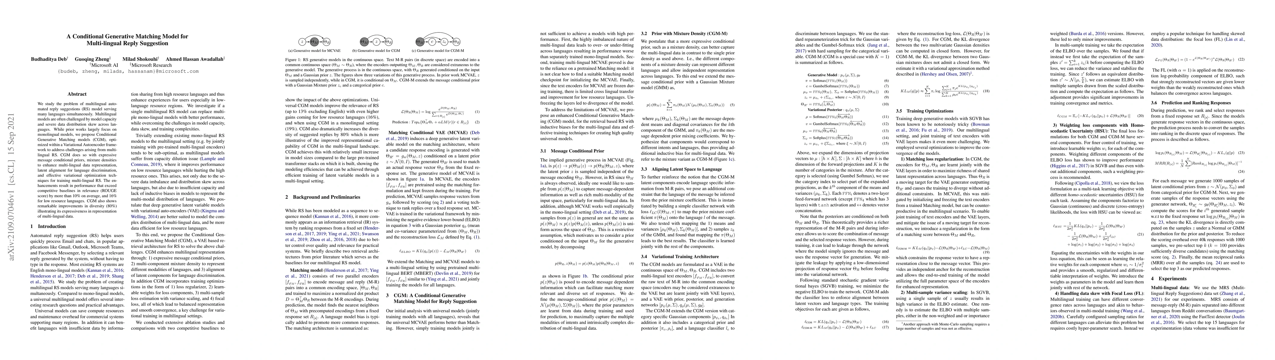 This paper proposes a Conditional Generative Matching model (CGM) within a Variational Autoencoder framework for multilingual automated reply suggestions, addressing challenges of model capacity and data distribution skew across languages. CGM achieves superior performance over baselines, with notable improvements in relevance and diversity, especially for low-resource languages.