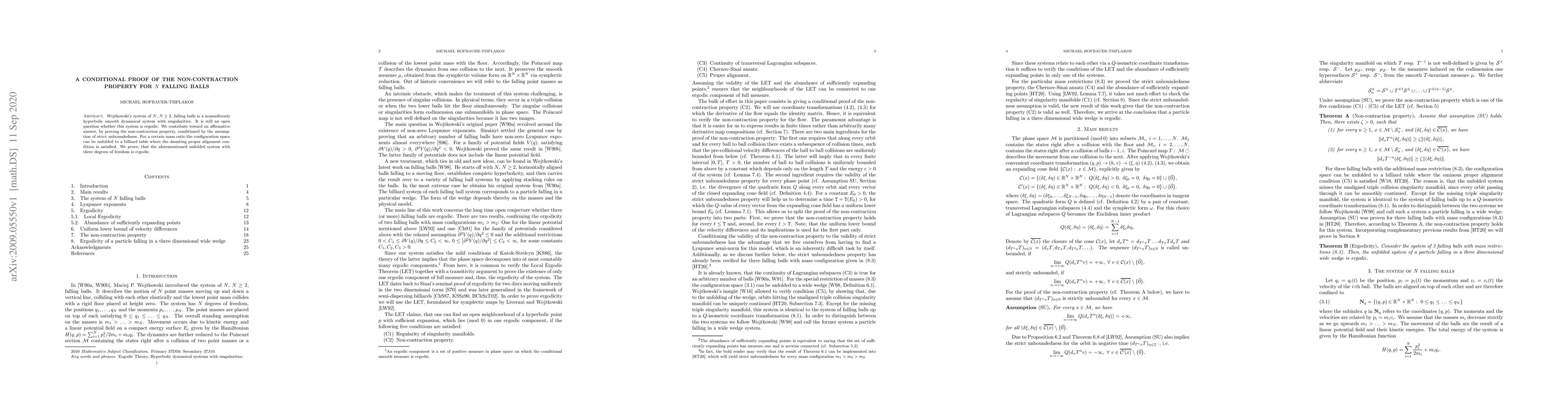 This research proves the non-contraction property for Wojtkowski's N falling balls system under strict unboundedness assumption, contributing to the ergodicity hypothesis. The study unfolds the 3D configuration space into a billiard table, satisfying the proper alignment condition for a specific mass ratio.