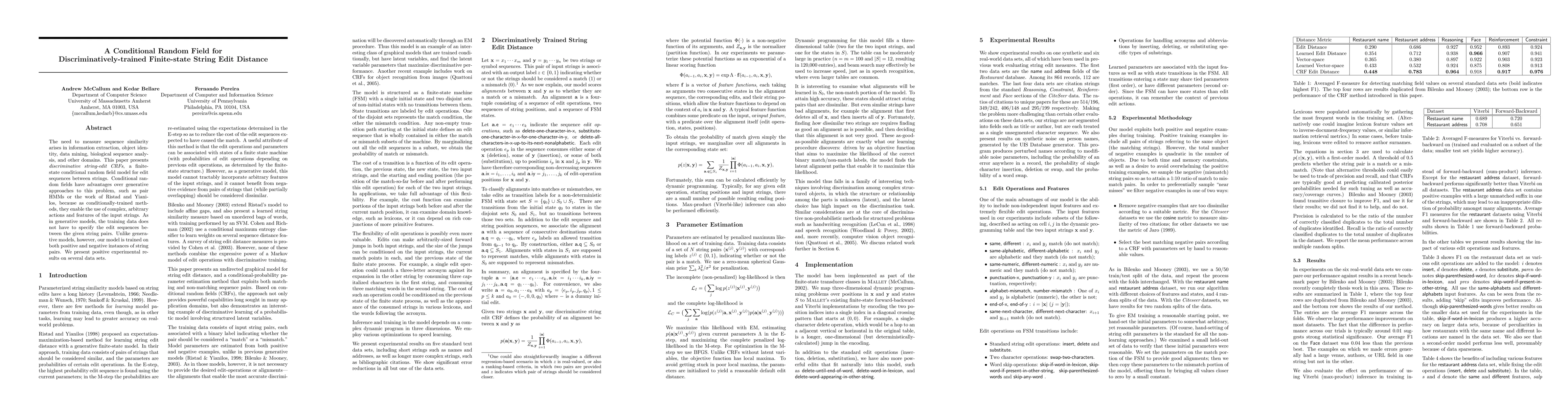 The need to measure sequence similarity arises in information extraction, object identity, data mining, biological sequence analysis, and other domains. This paper presents discriminative string-edit CRFs, a finitestate conditional random field model for edit sequences between strings. Conditional random fields have advantages over generative approaches to this problem, such as pair HMMs or the work of Ristad and Yianilos, because as conditionally-trained methods, they enable the use of complex, arbitrary actions and features of the input strings. As in generative models, the training data does not have to specify the edit sequences between the given string pairs. Unlike generative models, however, our model is trained on both positive and negative instances of string pairs. We present positive experimental results on several data sets.