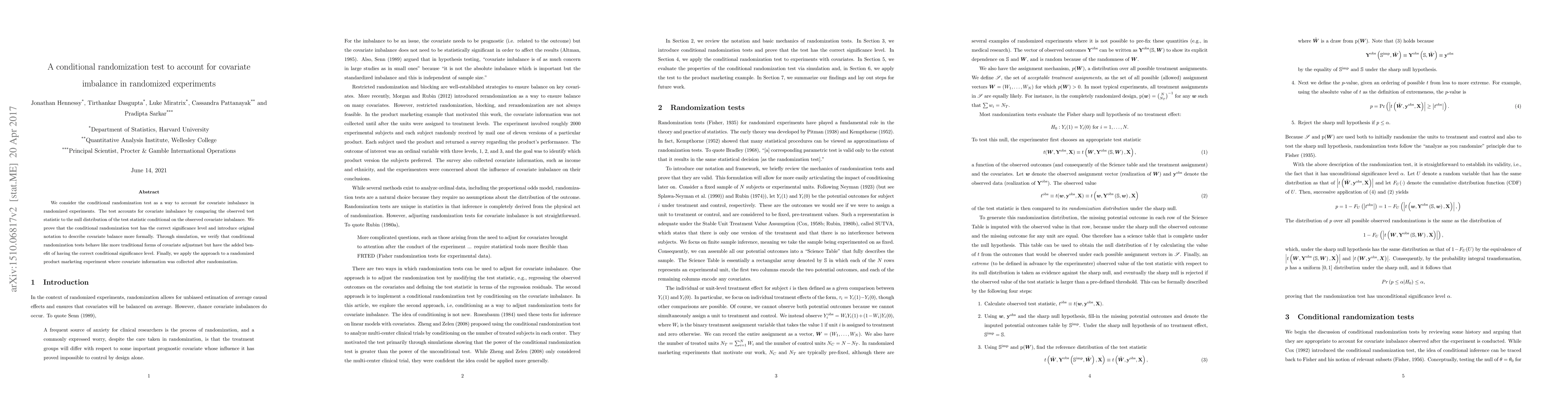 We consider the conditional randomization test as a way to account for covariate imbalance in randomized experiments. The test accounts for covariate imbalance by comparing the observed test statistic to the null distribution of the test statistic conditional on the observed covariate imbalance. We prove that the conditional randomization test has the correct significance level and introduce original notation to describe covariate balance more formally. Through simulation, we verify that conditional randomization tests behave like more traditional forms of covariate adjustmet but have the added benefit of having the correct conditional significance level. Finally, we apply the approach to a randomized product marketing experiment where covariate information was collected after randomization.