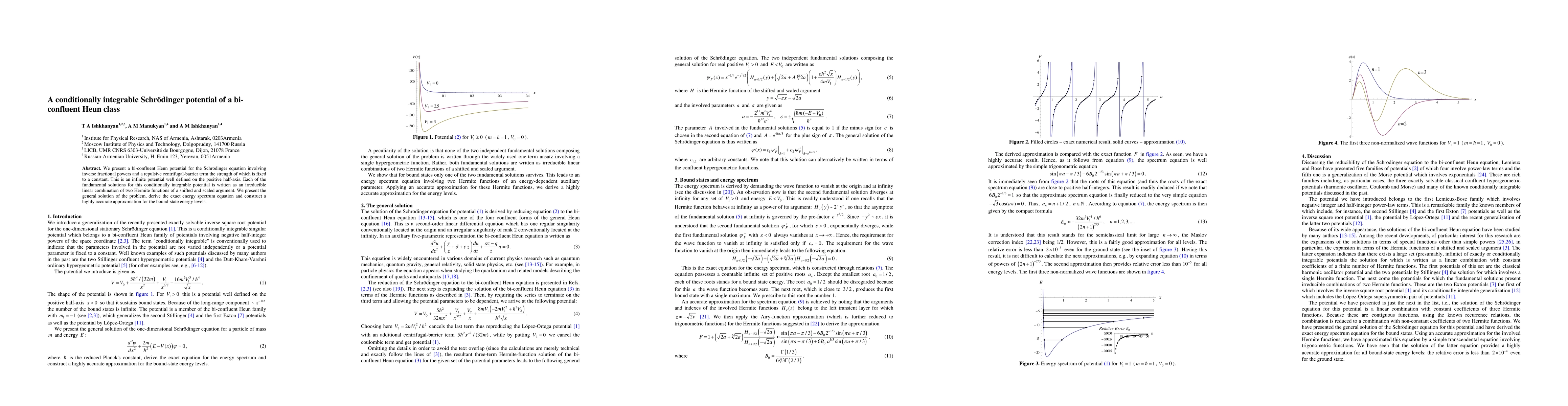 We present a bi-confluent Heun potential for the Schr\"odinger equation involving inverse fractional powers and a repulsive centrifugal-barrier term the strength of which is fixed to a constant. This is an infinite potential well defined on the positive half-axis. Each of the fundamental solutions for this conditionally integrable potential is written as an irreducible linear combination of two Hermite functions of a shifted and scaled argument. We present the general solution of the problem, derive the exact energy spectrum equation and construct a highly accurate approximation for the bound-state energy levels.