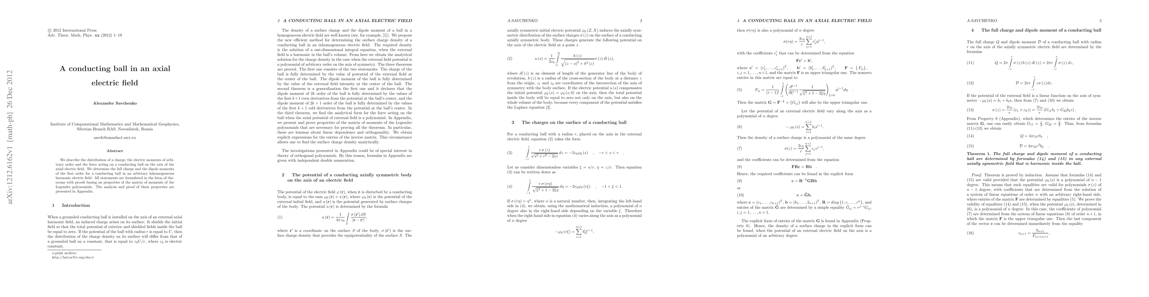 This paper explores how a conducting ball behaves in an axial electric field, determining its full charge and dipole moments, and formulating these findings as theorems with proof based on Legendre polynomial properties.