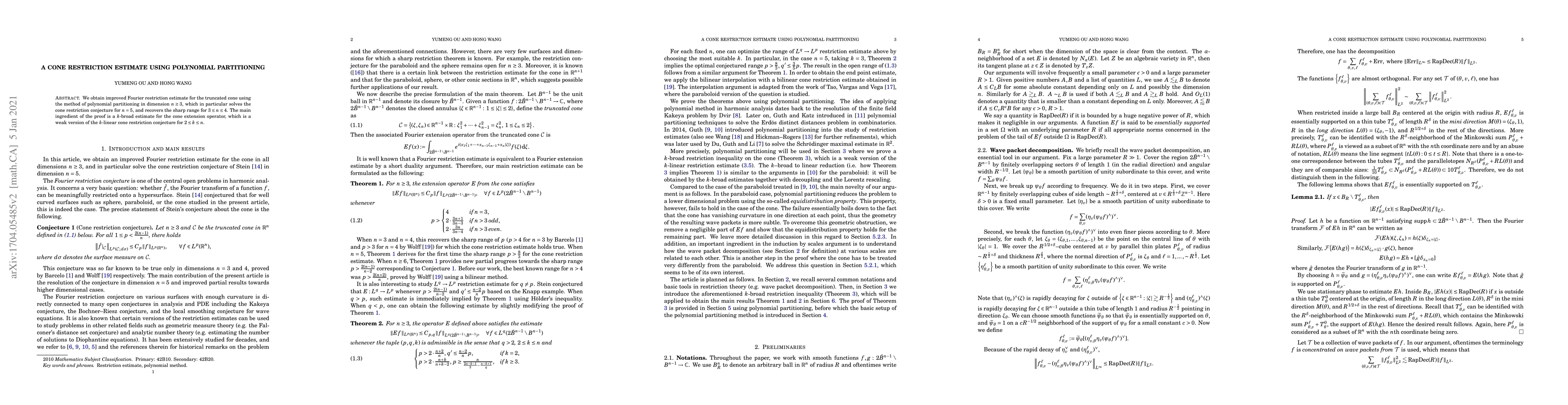 This paper presents a novel Fourier restriction estimate for truncated cones using polynomial partitioning, resolving the cone restriction conjecture for dimension $n=5$ and establishing sharp ranges for $3\leq n\leq 4$, relying on a $k$-broad estimate for the cone extension operator.