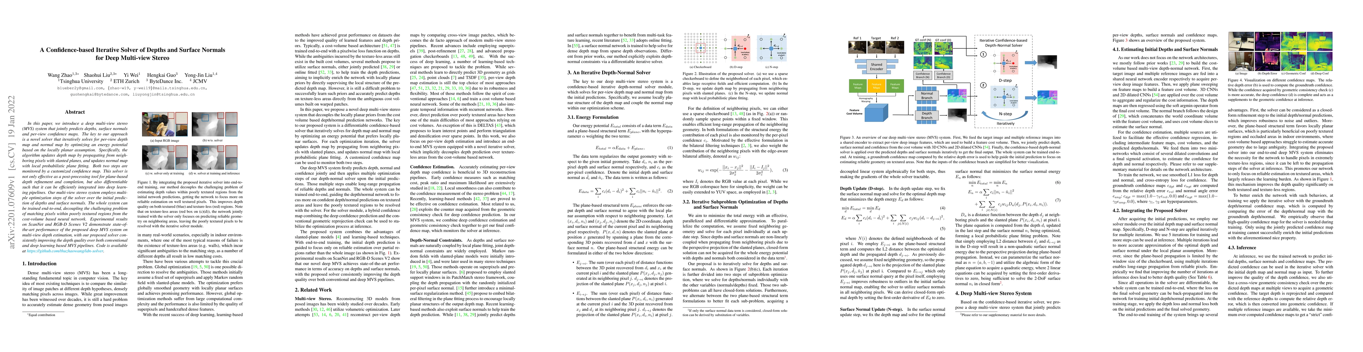 In this paper, we introduce a deep multi-view stereo (MVS) system that jointly predicts depths, surface normals and per-view confidence maps. The key to our approach is a novel solver that iteratively solves for per-view depth map and normal map by optimizing an energy potential based on the locally planar assumption. Specifically, the algorithm updates depth map by propagating from neighboring pixels with slanted planes, and updates normal map with local probabilistic plane fitting. Both two steps are monitored by a customized confidence map. This solver is not only effective as a post-processing tool for plane-based depth refinement and completion, but also differentiable such that it can be efficiently integrated into deep learning pipelines. Our multi-view stereo system employs multiple optimization steps of the solver over the initial prediction of depths and surface normals. The whole system can be trained end-to-end, decoupling the challenging problem of matching pixels within poorly textured regions from the cost-volume based neural network. Experimental results on ScanNet and RGB-D Scenes V2 demonstrate state-of-the-art performance of the proposed deep MVS system on multi-view depth estimation, with our proposed solver consistently improving the depth quality over both conventional and deep learning based MVS pipelines. Code is available at https://github.com/thuzhaowang/idn-solver.