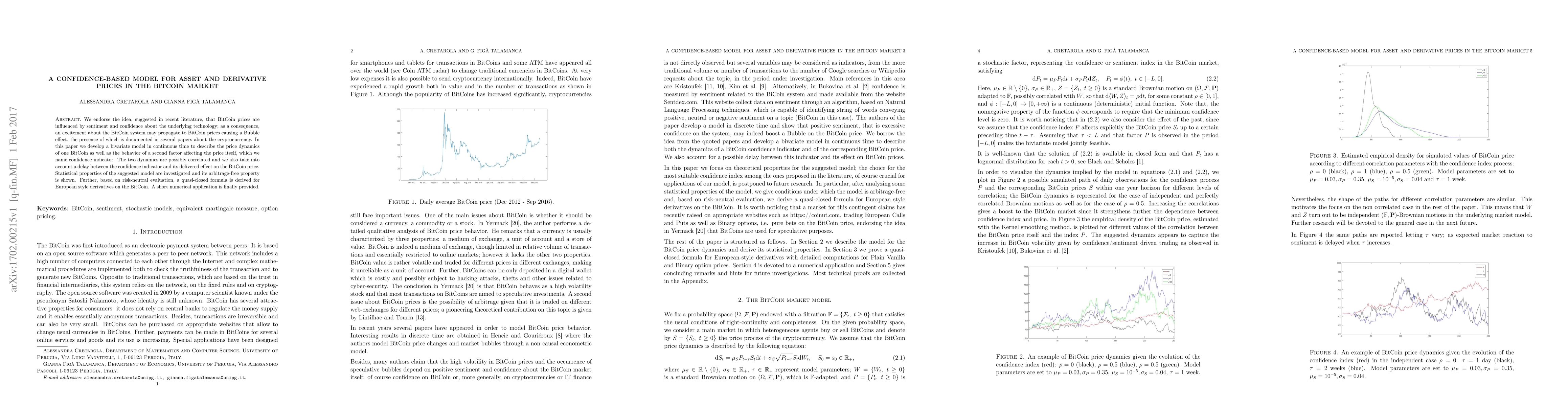 A new model explains how confidence in Bitcoin technology affects its price, which can lead to a bubble effect. The model also provides a formula for pricing European-style derivatives on Bitcoin.