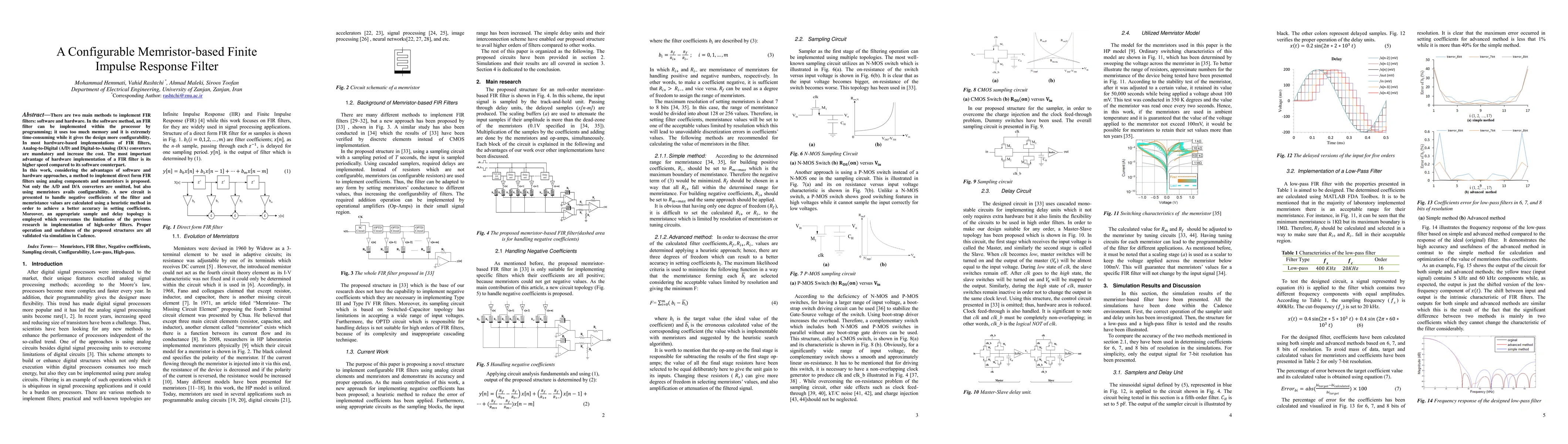 There are two main methods to implement FIR filters: software and hardware. In the software method, an FIR filter can be implemented within the processor by programming; it uses too much memory and it is extremely time-consuming while it gives the design more configurability. In most hardware-based implementations of FIR filters, Analog-to-Digital (A/D) and Digital-to-Analog (D/A) converters are mandatory and increase the cost. The most important advantage of hardware implementation of a FIR filter is its higher speed compared to its software counterpart. In this work, considering the advantages of software and hardware approaches, a method to implement direct form FIR filters using analog components and memristors is proposed. Not only the A/D and D/A converters are omitted, but also using memristors avails configurability. A new circuit is presented to handle negative coefficients of the filter and memristance values are calculated using a heuristic method in order to achieve a better accuracy in setting coefficients. Moreover, an appropriate sample and delay topology is employed which overcomes the limitations of the previous research in implementation of high-order filters. Proper operation and usefulness of the proposed structures are all validated via simulation in Cadence.
