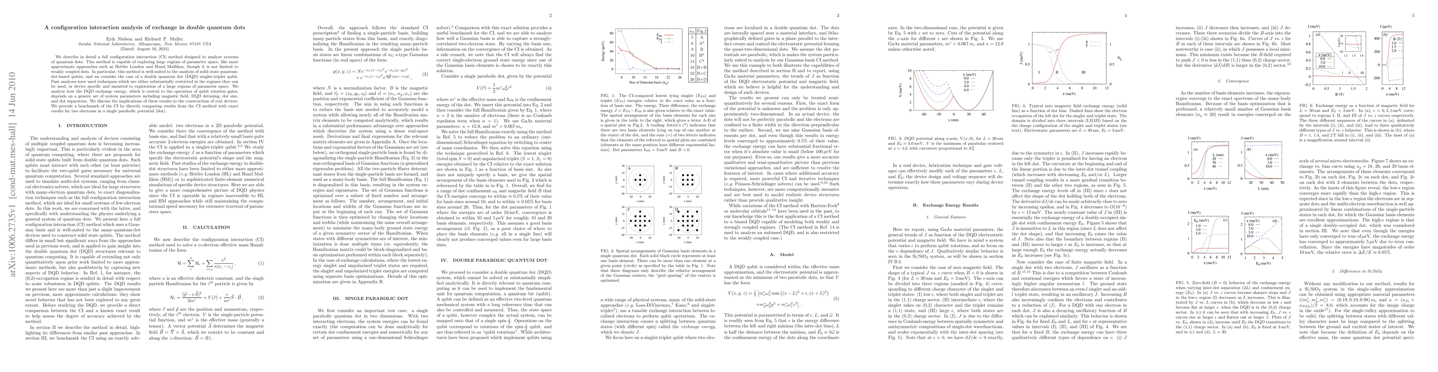 We describe in detail a full configuration interaction (CI) method designed to analyze systems of quantum dots. This method is capable of exploring large regions of parameter space, like more approximate approaches such as Heitler London and Hund Mulliken, though it is not limited to weakly coupled dots. In particular, this method is well-suited to the analysis of solid state quantum-dot-based qubits, and we consider the case of a double quantum dot (DQD) singlet-triplet qubit. Past analyses have used techniques which are either substantially restricted in the regimes they can be used, or device specific and unsuited to exploration of a large regions of parameter space. We analyze how the DQD exchange energy, which is central to the operation of qubit rotation gates, depends on a generic set of system parameters including magnetic field, DQD detuning, dot size, and dot separation. We discuss the implications of these results to the construction of real devices. We provide a benchmark of the CI by directly comparing results from the CI method with exact results for two electrons in a single parabolic potential (dot).