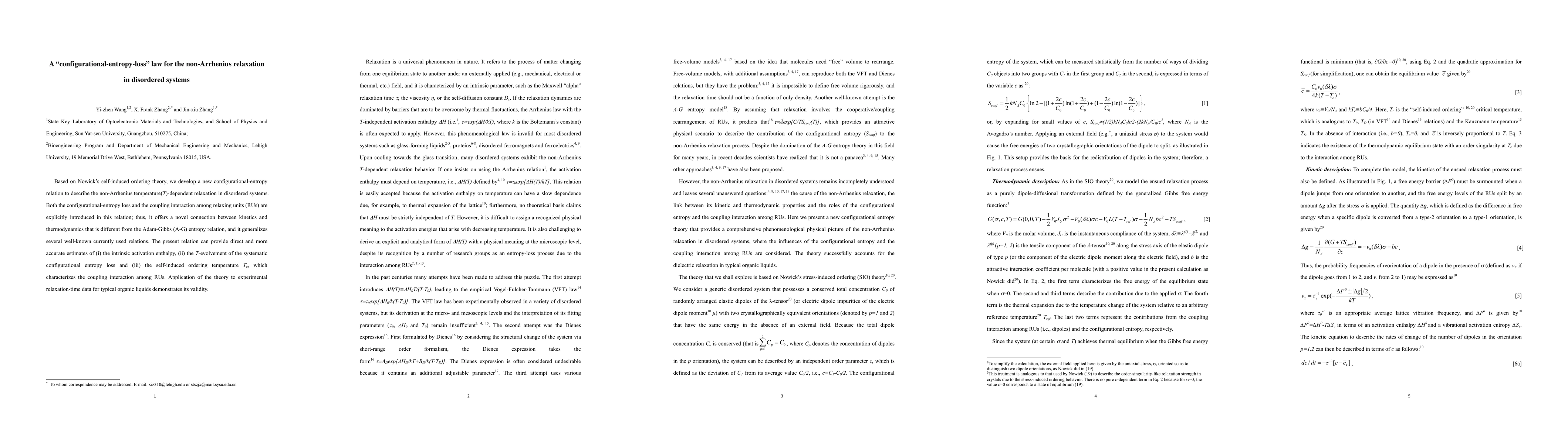 Based on Nowick's self-induced ordering theory, we develop a new configurational-entropy relation to describe the non-Arrhenius temperature(T)-dependent relaxation in disordered systems. Both the configurational-entropy loss and the coupling interaction among relaxing units (RUs) are explicitly introduced in this relation; thus, it offers a novel connection between kinetics and thermodynamics that is different from the Adam-Gibbs (A-G) entropy relation, and it generalizes several well-known currently used relations. The present relation can provide direct and more accurate estimates of (i) the intrinsic activation enthalpy, (ii) the T-evolvement of the systematic configurational entropy loss and (iii) the self-induced ordering temperature Tc, which characterizes the coupling interaction among RUs. Application of the theory to experimental relaxation-time data for typical organic liquids demonstrates its validity.