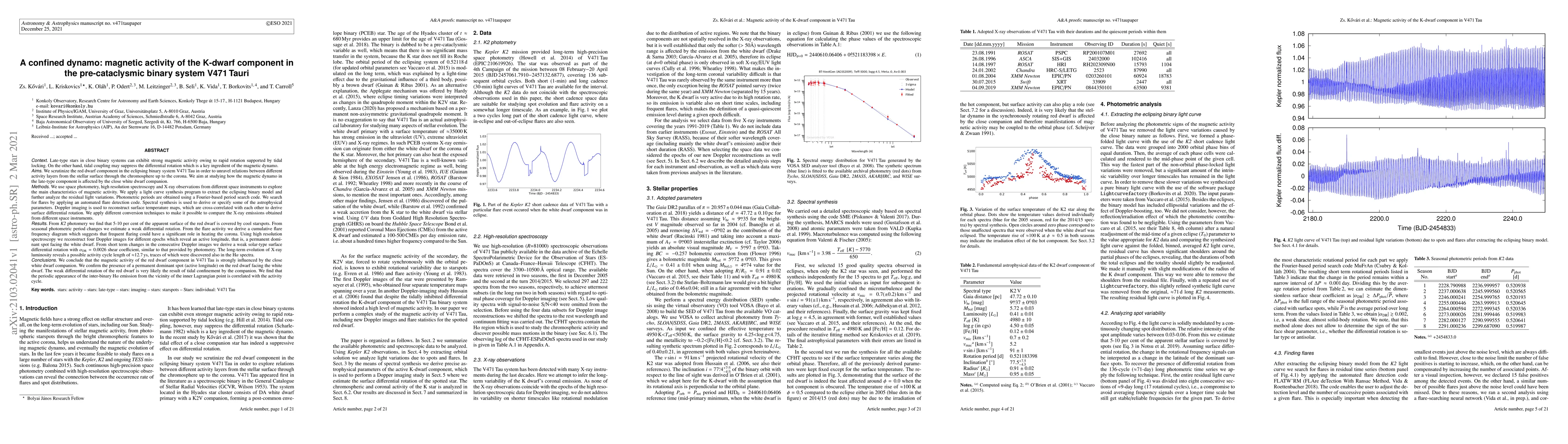 We scrutinize the red dwarf component in the eclipsing binary system V471 Tau in order to unravel relations between different activity layers from the stellar surface through the chromosphere up to the corona. We aim at studying how the magnetic dynamo in the late-type component is affected by the close white dwarf companion. We use space photometry, high resolution spectroscopy and X-ray observations from different space instruments to explore the main characteristics of magnetic activity. From K2 photomery we find that 5-10 per cent of the apparent surface of the red dwarf is covered by cool starspots. From seasonal photometric period changes we estimate a weak differential rotation. From the flare activity we derive a cumulative flare frequency diagram which suggests that frequent flaring could have a significant role in heating the corona. Using high resolution spectroscopy we reconstruct four Doppler images for different epochs which reveal an active longitude, that is, a permanent dominant spot facing the white dwarf. From short term changes in the consecutive Doppler images we derive a weak solar-type surface differential rotation with 0.0026 shear coefficient, similar to that provided by photometry. The long-term evolution of X-ray luminosity reveals a possible activity cycle length of 12.7 ys, traces of which were discovered also in the H$\alpha$ spectra. We conclude that the magnetic activity of the red dwarf component in V471 Tau is strongly influenced by the close white dwarf companion. We confirm the presence of a permanent dominant spot (active longitude) on the red dwarf facing the white dwarf. The weak differential rotation of the red dwarf is very likely the result of tidal confinement by the companion. We find that the periodic appearance of the inter-binary H$\alpha$ emission from the vicinity of the inner Lagrangian point is correlated with the activity cycle.