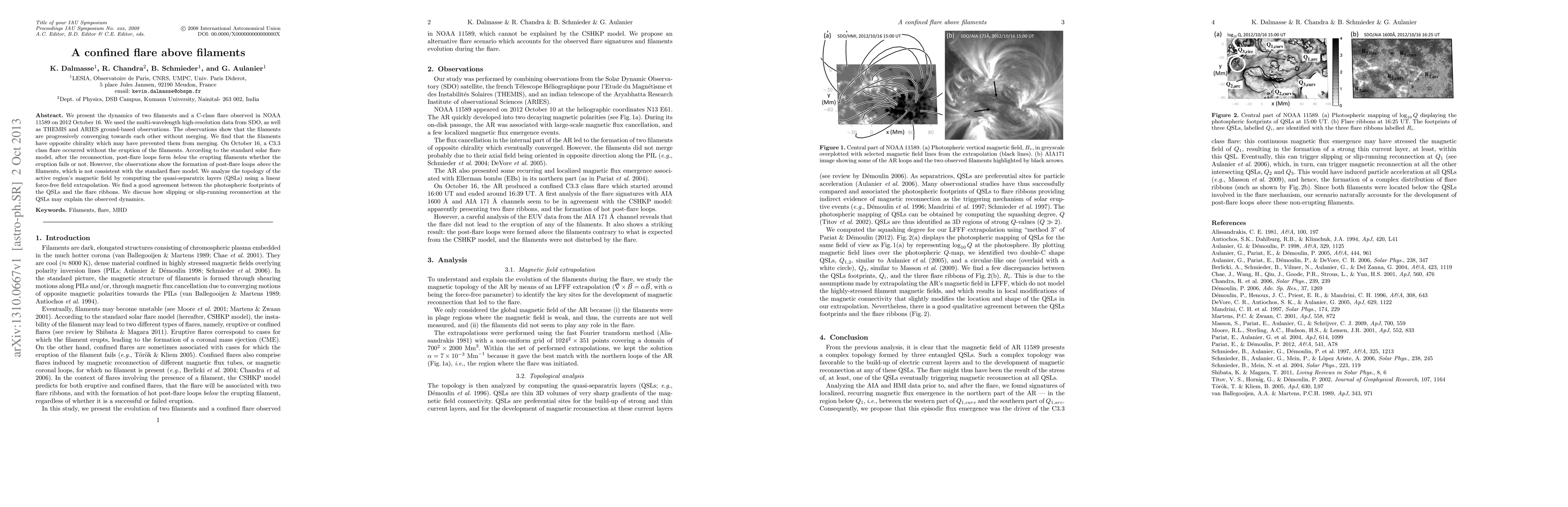 We present the dynamics of two filaments and a C-class flare observed in NOAA 11589 on 2012 October 16. We used the multi-wavelength high-resolution data from SDO, as well as THEMIS and ARIES ground-based observations. The observations show that the filaments are progressively converging towards each other without merging. We find that the filaments have opposite chirality which may have prevented them from merging. On October 16, a C3.3 class flare occurred without the eruption of the filaments. According to the standard solar flare model, after the reconnection, post-flare loops form {\it below} the erupting filaments whether the eruption fails or not. However, the observations show the formation of post-flare loops {\it above} the filaments, which is not consistent with the standard flare model. We analyze the topology of the active region's magnetic field by computing the quasi-separatrix layers (QSLs) using a linear force-free field extrapolation. We find a good agreement between the photospheric footprints of the QSLs and the flare ribbons. We discuss how slipping or slip-running reconnection at the QSLs may explain the observed dynamics.