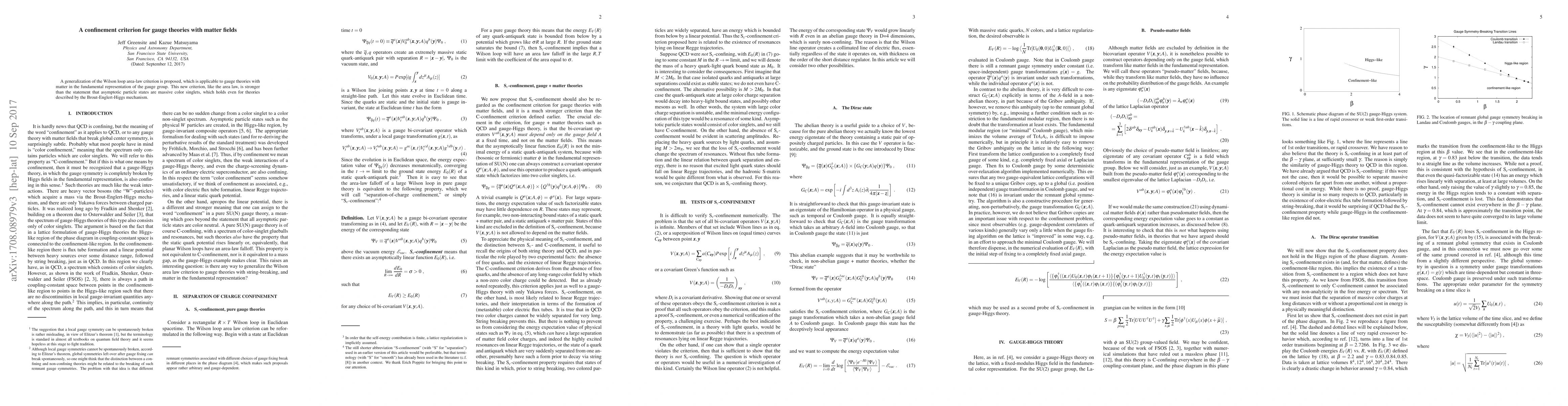 The paper proposes a new confinement criterion for gauge theories involving matter fields, extending the Wilson loop area-law. This criterion asserts stronger conditions than just massive color singlets, applicable beyond Higgs-described theories.