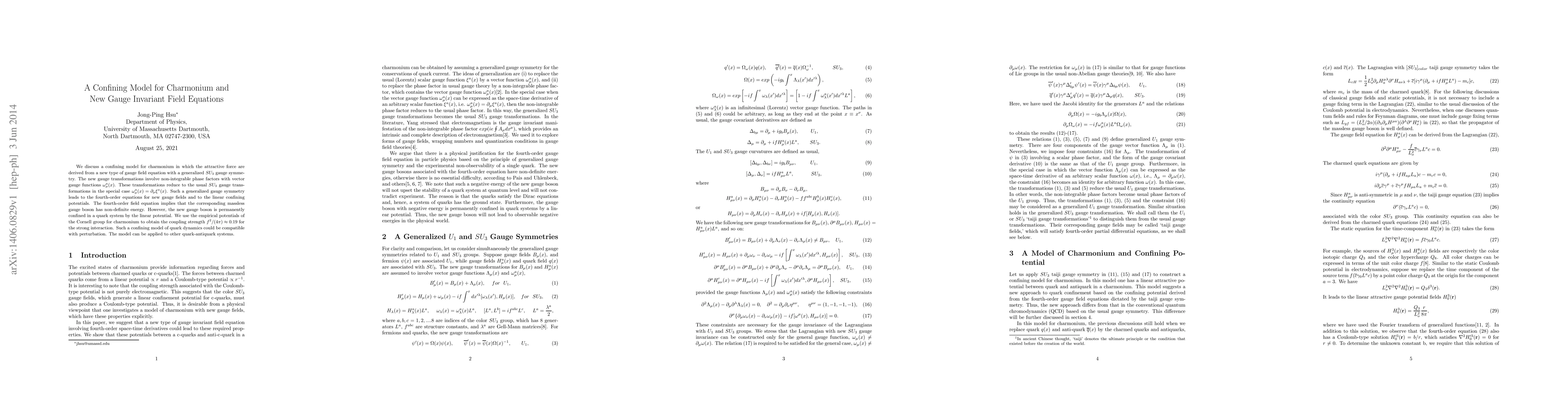 We discuss a confining model for charmonium in which the attractive force are derived from a new type of gauge field equation with a generalized $SU_3$ gauge symmetry. The new gauge transformations involve non-integrable phase factors with vector gauge functions $\om^a_{\mu}(x)$. These transformations reduce to the usual $SU_3$ gauge transformations in the special case $\om^a_\mu(x) = \p_\mu \xi^a(x)$. Such a generalized gauge symmetry leads to the fourth-order equations for new gauge fields and to the linear confining potentials. The fourth-order field equation implies that the corresponding massless gauge boson has non-definite energy. However, the new gauge boson is permanently confined in a quark system by the linear potential. We use the empirical potentials of the Cornell group for charmonium to obtain the coupling strength $f^2/(4\pi) \approx 0.19$ for the strong interaction. Such a confining model of quark dynamics could be compatible with perturbation. The model can be applied to other quark-antiquark systems.
