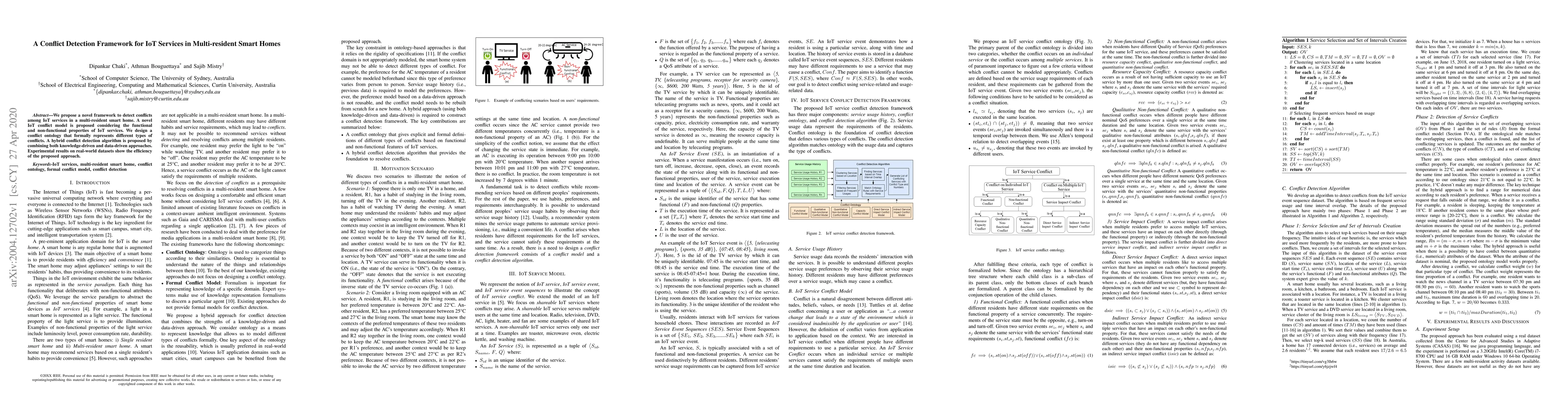 This paper introduces a framework for detecting conflicts among IoT services in multi-resident smart homes, proposing a novel conflict model and ontology, and a hybrid conflict detection algorithm combining knowledge-driven and data-driven methods. Experimental results demonstrate the efficiency of the proposed approach.