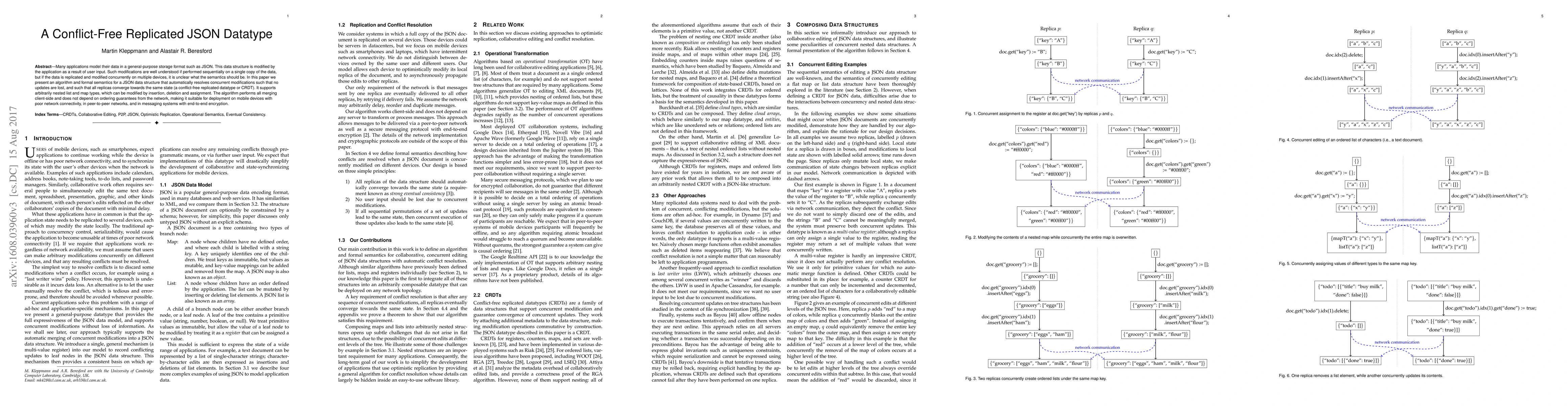 This paper introduces an algorithm and formal semantics for a conflict-free replicated JSON datatype (CRDT) that resolves concurrent modifications without data loss and ensures all replicas converge to the same state. It supports nested lists and maps, merging changes client-side without network ordering guarantees, ideal for mobile and peer-to-peer environments.