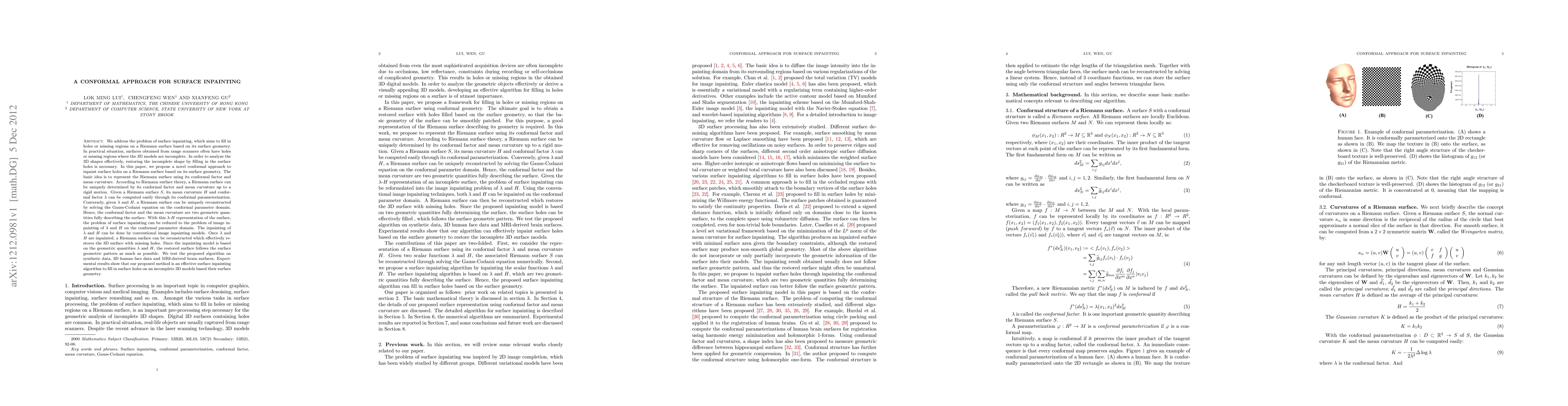 We address the problem of surface inpainting, which aims to fill in holes or missing regions on a Riemann surface based on its surface geometry. In practical situation, surfaces obtained from range scanners often have holes where the 3D models are incomplete. In order to analyze the 3D shapes effectively, restoring the incomplete shape by filling in the surface holes is necessary. In this paper, we propose a novel conformal approach to inpaint surface holes on a Riemann surface based on its surface geometry. The basic idea is to represent the Riemann surface using its conformal factor and mean curvature. According to Riemann surface theory, a Riemann surface can be uniquely determined by its conformal factor and mean curvature up to a rigid motion. Given a Riemann surface $S$, its mean curvature $H$ and conformal factor $\lambda$ can be computed easily through its conformal parameterization. Conversely, given $\lambda$ and $H$, a Riemann surface can be uniquely reconstructed by solving the Gauss-Codazzi equation on the conformal parameter domain. Hence, the conformal factor and the mean curvature are two geometric quantities fully describing the surface. With this $\lambda$-$H$ representation of the surface, the problem of surface inpainting can be reduced to the problem of image inpainting of $\lambda$ and $H$ on the conformal parameter domain. Once $\lambda$ and $H$ are inpainted, a Riemann surface can be reconstructed which effectively restores the 3D surface with missing holes. Since the inpainting model is based on the geometric quantities $\lambda$ and $H$, the restored surface follows the surface geometric pattern. We test the proposed algorithm on synthetic data as well as real surface data. Experimental results show that our proposed method is an effective surface inpainting algorithm to fill in surface holes on an incomplete 3D models based their surface geometry.