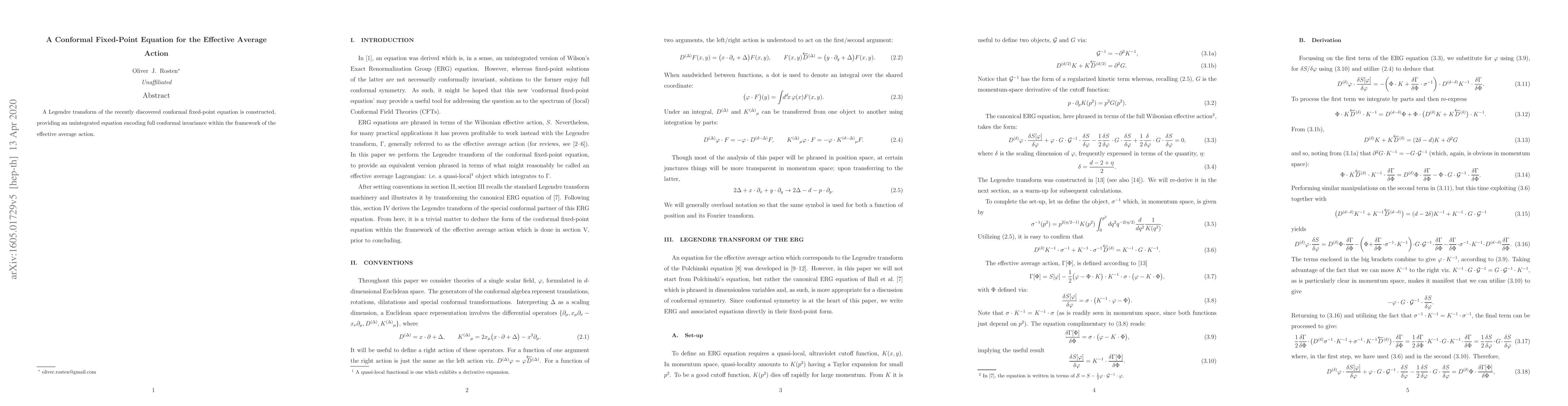 Summary: This paper constructs a Legendre transform of the conformal fixed-point equation, yielding an unintegrated equation that fully encodes conformal invariance within the effective average action framework. The result enhances our understanding of conformal invariance in quantum field theory.
