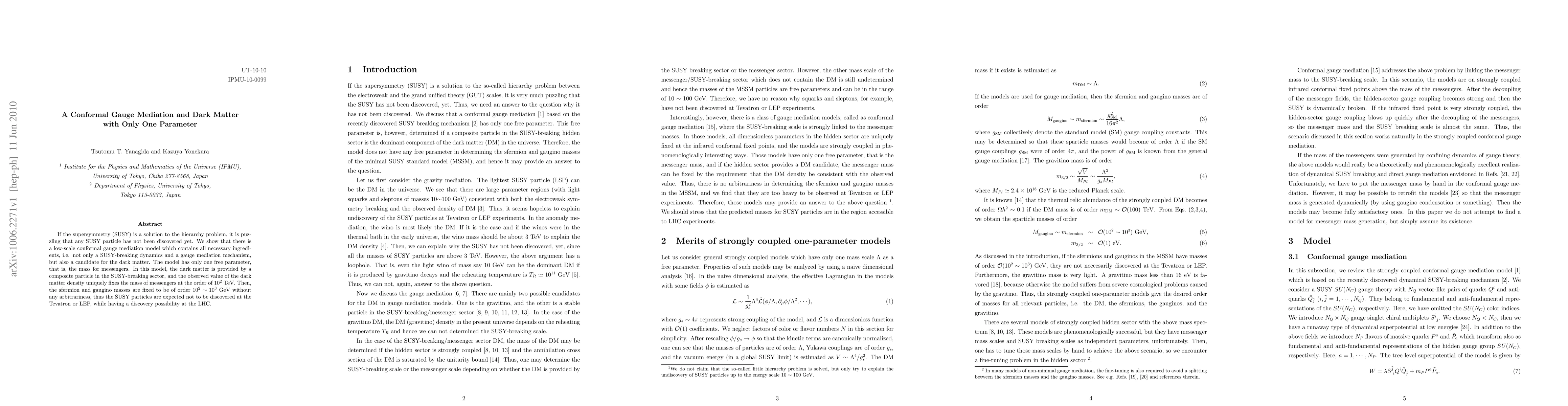 If the supersymmetry (SUSY) is a solution to the hierarchy problem, it is puzzling that any SUSY particle has not been discovered yet. We show that there is a low-scale conformal gauge mediation model which contains all necessary ingredients, i.e. not only a SUSY-breaking dynamics and a gauge mediation mechanism, but also a candidate for the dark matter. The model has only one free parameter, that is, the mass for messengers. In this model, the dark matter is provided by a composite particle in the SUSY-breaking sector, and the observed value of the dark matter density uniquely fixes the mass of messengers at the order of 10^2 TeV. Then, the sfermion and gaugino masses are fixed to be of order 10^2~10^3 GEV without any arbitrariness, thus the SUSY particles are expected not to be discovered at the Tevatron or LEP, while having a discovery possibility at the LHC.