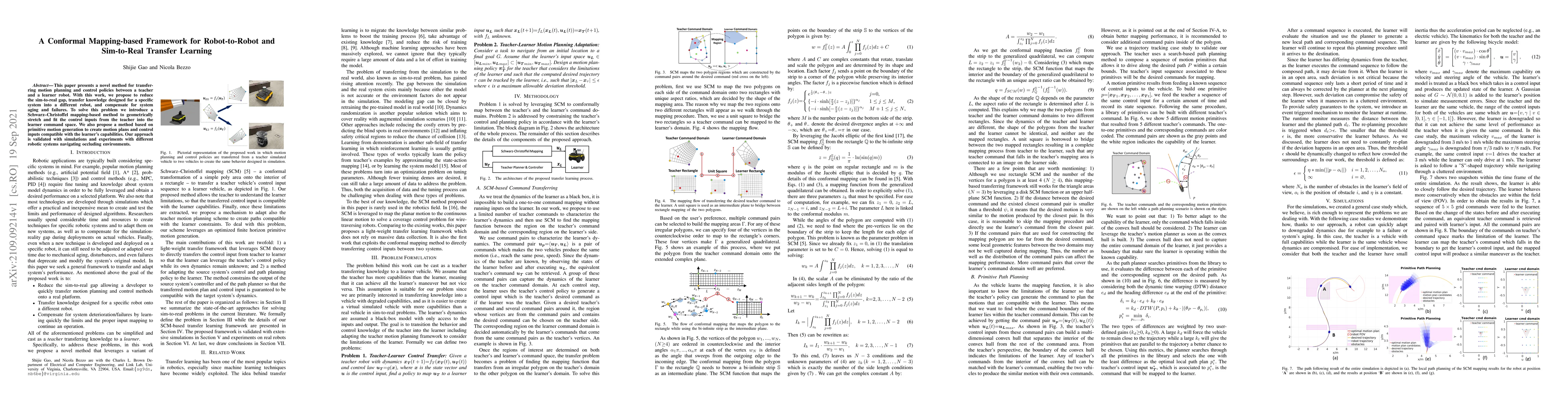 This paper presents a novel method for transferring motion planning and control policies between a teacher and a learner robot. With this work, we propose to reduce the sim-to-real gap, transfer knowledge designed for a specific system into a different robot, and compensate for system aging and failures. To solve this problem we introduce a Schwarz-Christoffel mapping-based method to geometrically stretch and fit the control inputs from the teacher into the learner command space. We also propose a method based on primitive motion generation to create motion plans and control inputs compatible with the learner's capabilities. Our approach is validated with simulations and experiments with different robotic systems navigating occluding environments.