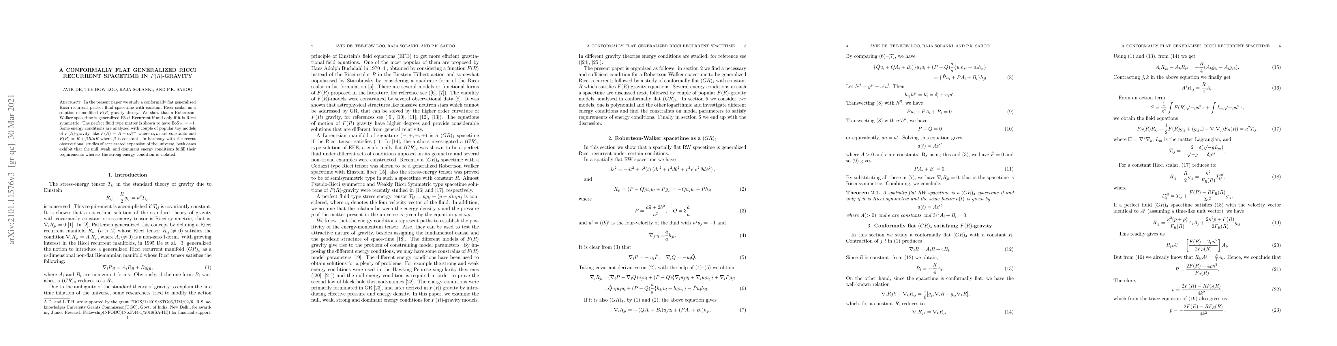 In the present paper we study a conformally flat generalized Ricci recurrent perfect fluid spacetime with constant Ricci scalar as a solution of modified $F(R)$-gravity theory. We show that a Robertson-Walker spacetime is generalized Ricci Recurrent if and only if it is Ricci symmetric. The perfect fluid type matter is shown to have EoS $\omega=-1$. Some energy conditions are analyzed with couple of popular toy models of $F(R)$-gravity, like $F(R)= R+\alpha R^m $ where $\alpha, m$ are constants and $ F(R)=R+\beta RlnR $ where $\beta $ is constant. In harmony with the recent observational studies of accelerated expansion of the universe, both cases exhibit that the null, weak, and dominant energy conditions fulfill their requirements whereas the strong energy condition is violated.