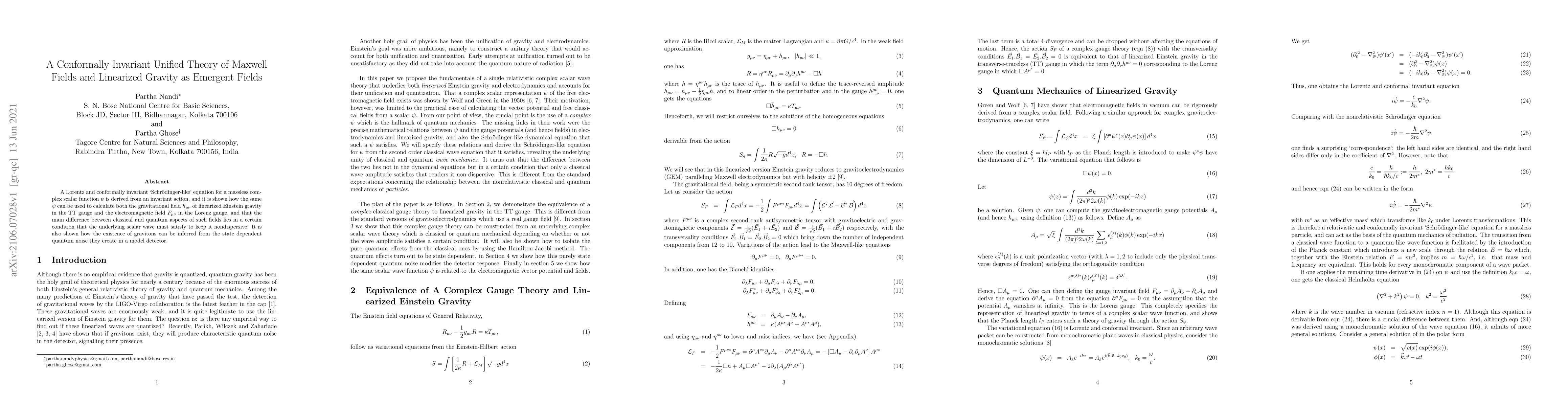 A Lorentz and conformally invariant `Schr\"{o}dinger-like' equation for a massless complex scalar function $\psi$ is derived from an invariant action, and it is shown how the same $\psi$ can be used to calculate both the gravitational field $h_{\mu\nu}$ of linearized Einstein gravity in the TT gauge and the electromagnetic field $F_{\mu\nu}$ in the Lorenz gauge, and that the main difference between classical and quantum aspects of such fields lies in a certain condition that the underlying scalar wave must satisfy to keep it nondispersive. It is also shown how the existence of gravitons can be inferred from the state-dependent quantum noise they create in a model detector.