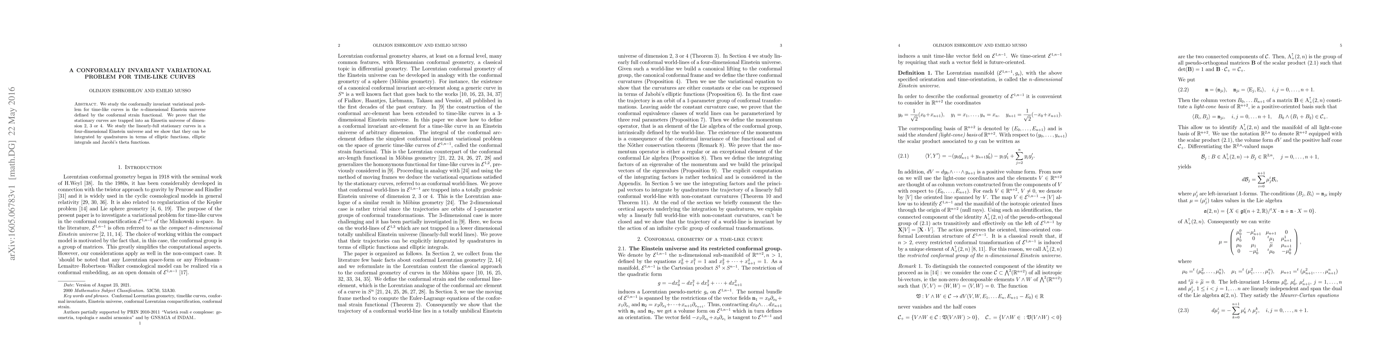 This paper investigates the conformally invariant variational problem for time-like curves in an $n$-dimensional Einstein universe, proving that stationary curves are confined to dimensions $2$, $3$, or $4$. It further explores linearly-full stationary curves in a four-dimensional universe, demonstrating their integrability via elliptic functions and Jacobi's theta functions.