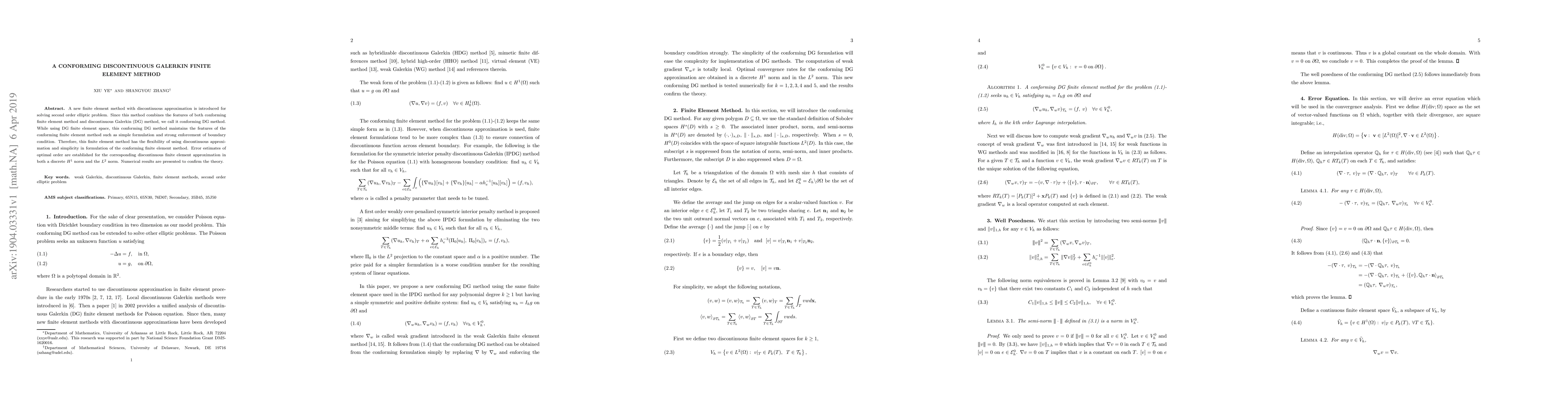 The paper introduces a new conforming discontinuous Galerkin (DG) finite element method for solving second-order elliptic problems, combining the benefits of both conforming methods and DG methods. It provides error estimates of optimal order and confirms the theory with numerical results.