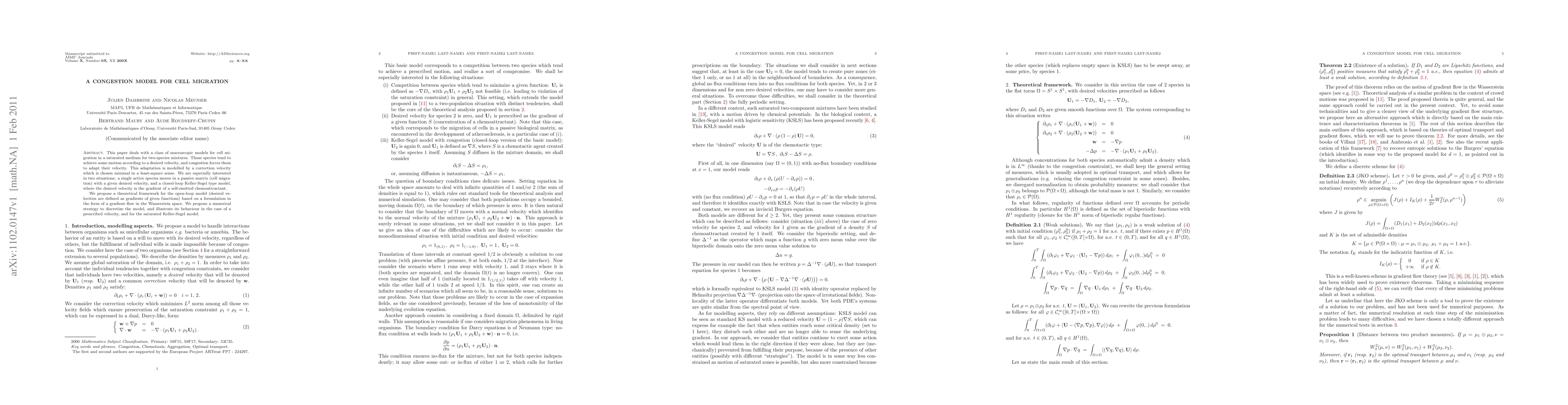 This paper proposes a congestion model for cell migration in saturated media, exploring how cells adapt their velocity to avoid congestion forces. It offers a theoretical framework based on gradient flows in Wasserstein space and provides numerical strategies for the open-loop Keller-Segel model.