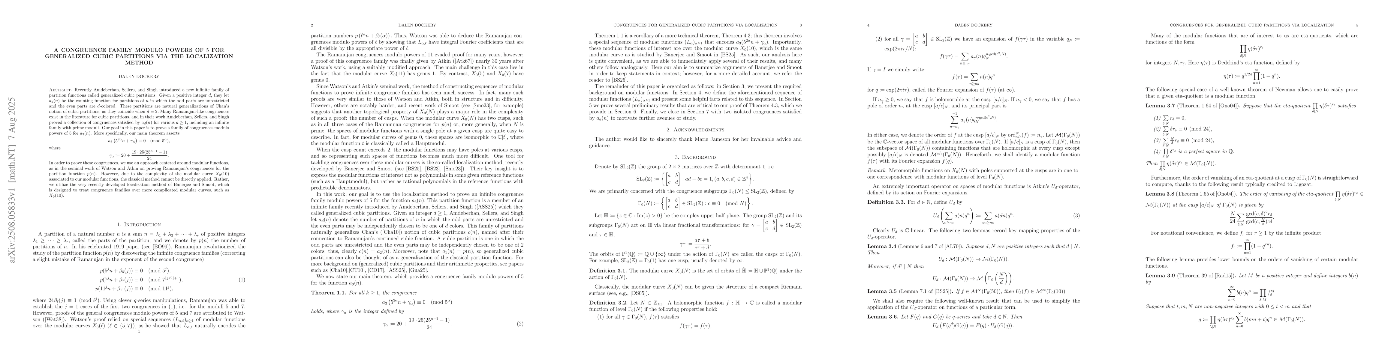 Recently Amdeberhan, Sellers, and Singh introduced a new infinite family of partition functions called generalized cubic partitions. Given a positive integer $d$, they let $a_d(n)$ be the counting function for partitions of $n$ in which the odd parts are unrestricted and the even parts are $d$-colored. These partitions are natural generalizations of Chan's notion of cubic partitions, as they coincide when $d=2.$ Many Ramanujan-like congruences exist in the literature for cubic partitions, and in their work Amdeberhan, Sellers, and Singh proved a collection of congruences satisfied by $a_d(n)$ for various $d \geq 1$, including an infinite family with prime moduli. Our goal in this paper is to prove a family of congruences modulo powers of 5 for $a_3(n)$. More specifically, our main theorem asserts \[a_3\left(5^{2\alpha}n +\gamma_{\alpha} \right) \equiv 0 \pmod{5^\alpha},\] where \[\gamma_{\alpha} = 20 + \frac{19 \cdot 25 (25^{\alpha-1}-1)}{24}.\] In order to prove these congruences, we use an approach centered around modular functions, as in the seminal work of Watson and Atkin on proving Ramanujan's congruences for the partition function $p(n)$. However, due to the complexity of the modular curve $X_0(10)$ associated to our modular functions, the classical method cannot be directly applied. Rather, we utilize the very recently developed localization method of Banerjee and Smoot, which is designed to treat congruence families over more complicated modular curves, such as $X_0(10).$