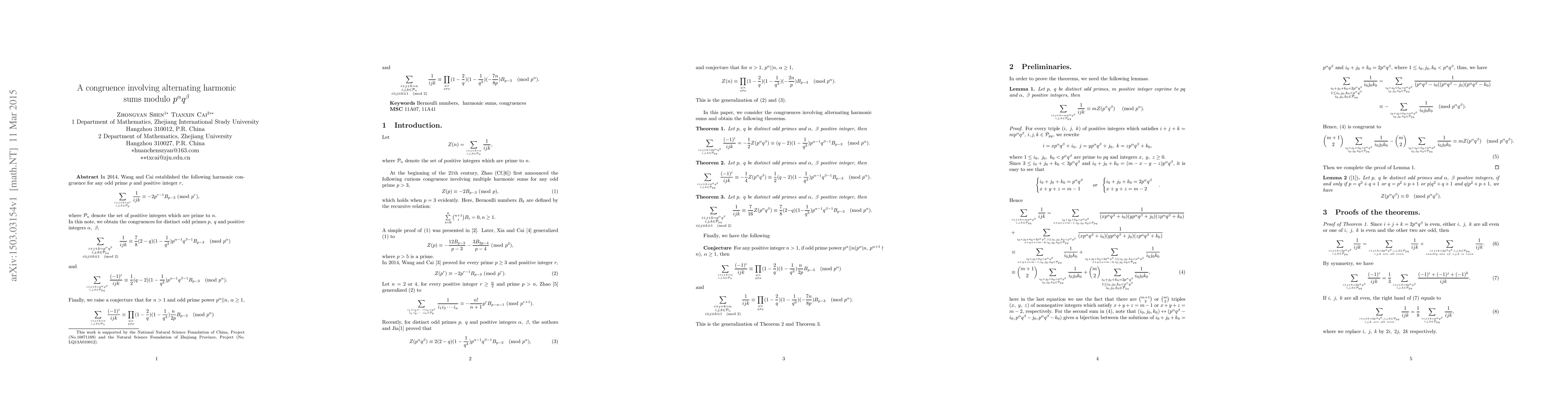 In 2014, Wang and Cai established the following harmonic congruence for any odd prime $p$ and positive integer $r$, \begin{equation*} \sum\limits_{i+j+k=p^{r}\atop{i,j,k\in \mathcal{P}_{p}}}\frac{1}{ijk}\equiv-2p^{r-1}B_{p-3} ~(\bmod ~ p^{r}), \end{equation*} where $\mathcal{P}_{n}$ denote the set of positive integers which are prime to $n$. In this note, we obtain the congruences for distinct odd primes $p,~q$ and positive integers $\alpha,~\beta$, \begin{equation*} \sum\limits_{i+j+k=p^{\alpha}q^{\beta}\atop{i,j,k\in\mathcal{P}_{pq}\atop{i\equiv j\equiv k\equiv 1\pmod{2}}}}\frac{1}{ijk}\equiv\frac{7}{8}(2-q)(1-\frac{1}{q^{3}})p^{\alpha-1}q^{\beta-1}B_{p-3}\pmod{p^{\alpha}} \end{equation*} and \begin{equation*} \sum\limits_{i+j+k=p^{\alpha}q^{\beta}\atop{i,j,k\in \mathcal{P}_{pq}}}\frac{(-1)^{i}}{ijk} \equiv \frac{1}{2}(q-2)(1-\frac{1}{q^{3}})p^{\alpha-1}q^{\beta-1}B_{p-3}\pmod{p^{\alpha}}. \end{equation*} Finally, we raise a conjecture that for $n>1$ and odd prime power $p^{\alpha}||n$, $\alpha\geq1$, \begin{eqnarray} \nonumber \sum\limits_{i+j+k=n\atop{i,j,k\in\mathcal{P}_{n}}}\frac{(-1)^{i}}{ijk} \equiv \prod\limits_{q|n\atop{q\neq p}}(1-\frac{2}{q})(1-\frac{1}{q^{3}})\frac{n}{2p}B_{p-3}\pmod{p^{\alpha}} \end{eqnarray} and \begin{eqnarray} \nonumber \sum\limits_{i+j+k=n\atop{i,j,k\in\mathcal{P}_{n}\atop{i\equiv j\equiv k\equiv 1\pmod{2}}}}\frac{1}{ijk} \equiv \prod\limits_{q|n\atop{q\neq p}}(1-\frac{2}{q})(1-\frac{1}{q^{3}})(-\frac{7n}{8p})B_{p-3}\pmod{p^{\alpha}}. \end{eqnarray}