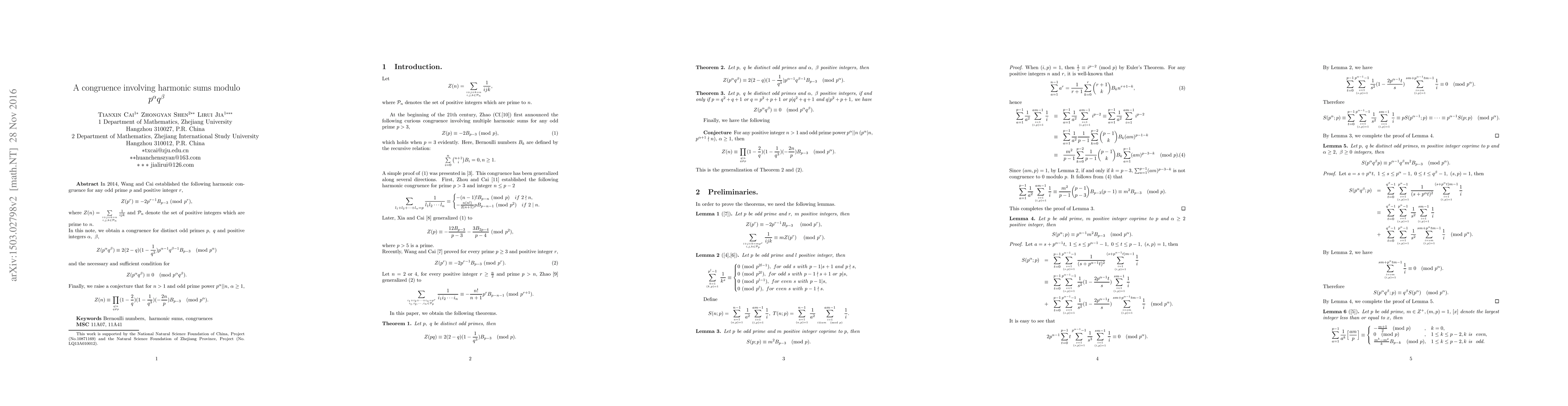 In 2014, Wang and Cai established the following harmonic congruence for any odd prime $p$ and positive integer $r$, \begin{equation*} Z(p^{r})\equiv-2p^{r-1}B_{p-3} ~(\bmod ~ p^{r}), \end{equation*} where $ Z(n)=\sum\limits_{i+j+k=n\atop{i,j,k\in\mathcal{P}_{n}}}\frac{1}{ijk}$ and $\mathcal{P}_{n}$ denote the set of positive integers which are prime to $n$. In this note, we obtain a congruence for distinct odd primes $p,~q$ and positive integers $\alpha,~\beta$, \begin{equation*} Z(p^{\alpha}q^{\beta})\equiv 2(2-q)(1-\frac{1}{q^{3}})p^{\alpha-1}q^{\beta-1}B_{p-3}\pmod{p^{\alpha}} \end{equation*} and the necessary and sufficient condition for \begin{equation*} Z(p^{\alpha}q^{\beta})\equiv 0\pmod{p^{\alpha}q^{\beta}}. \end{equation*} Finally, we raise a conjecture that for $n>1$ and odd prime power $p^{\alpha}||n$, $\alpha\geq1$, \begin{eqnarray} \nonumber Z(n)\equiv \prod\limits_{q|n\atop{q\neq p}}(1-\frac{2}{q})(1-\frac{1}{q^{3}})(-\frac{2n}{p})B_{p-3}\pmod{p^{\alpha}}. \end{eqnarray}