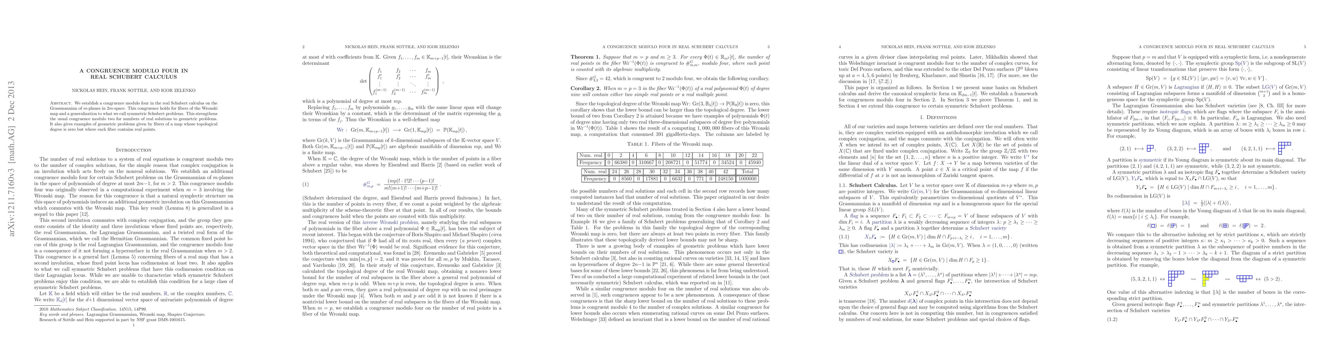 Summary: The paper establishes a new congruence modulo four in real Schubert calculus for fibers of the Wronski map on the Grassmannian, extending beyond the usual congruence modulo two, and provides examples of geometric problems with fibers containing real points despite having zero topological degree.