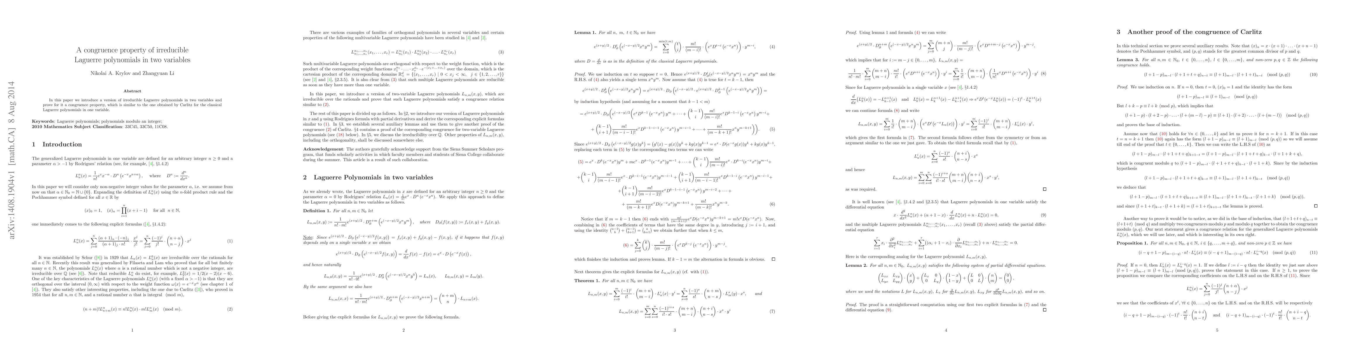 In this paper we introduce a version of irreducible Laguerre polynomials in two variables and prove for it a congruence property, which is similar to the one obtained by Carlitz for the classical Laguerre polynomials in one variable.
