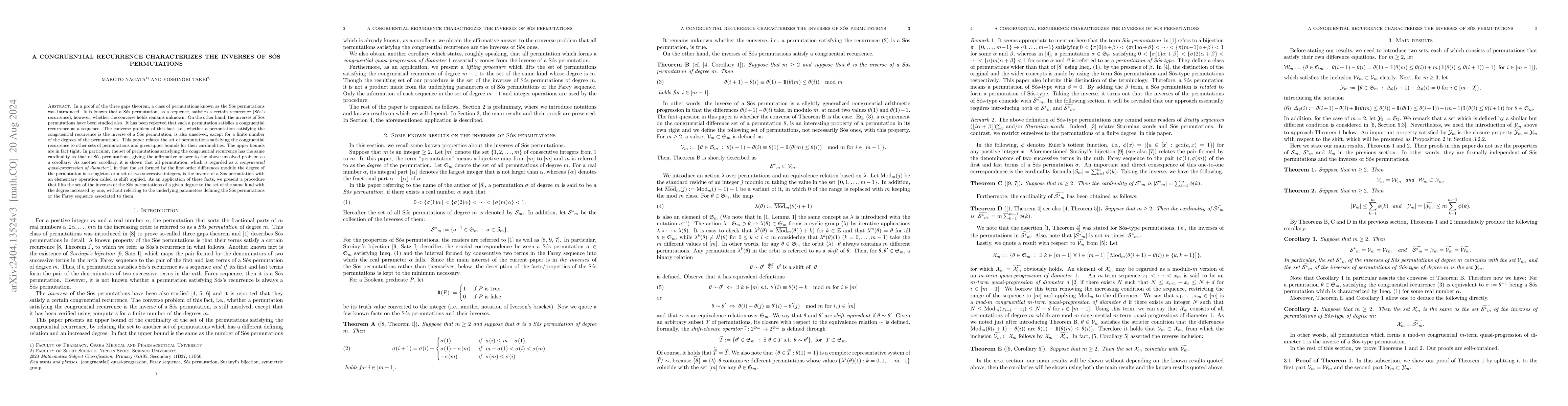 In a proof of the three gaps theorem, a class of permutations known as the S\'{o}s permutations was introduced. It is known that a S\'{o}s permutation, as a sequence, satisfies a certain recurrence (S\'{o}s's recurrence), however, whether the converse holds remains unknown. On the other hand, the inverses of S\'{o}s permutations have been studied also. It has been reported that such a permutation satisfies a congruential recurrence as a sequence. The converse problem of this fact, i.e., whether a permutation satisfying the congruential recurrence is the inverse of a S\'{o}s permutation, is also unsolved, except for a finite number of the degrees of the permutations. This paper relates the set of permutations satisfying the congruential recurrence to other sets of permutations and gives upper bounds for their cardinalities. The upper bounds are in fact tight. In particular, the set of permutations satisfying the congruential recurrence has the same cardinality as that of S\'{o}s permutations, giving the affirmative answer to the above unsolved problem as a corollary. As another corollary, it is shown that all permutation, which is regarded as a congruential quasi-progression of diameter 1 in that the set formed by the first order differences modulo the degree of the permutation is a singleton or a set of two successive integers, is the inverse of a S\'{o}s permutation with an elementary operation called as shift applied. As an application of these facts, we present a procedure that lifts the set of the inverses of the S\'{o}s permutations of a given degree to the set of the same kind with the degree increased by one, without referring to the underlying parameters defining the S\'{o}s permutations or the Farey sequence associated to them.