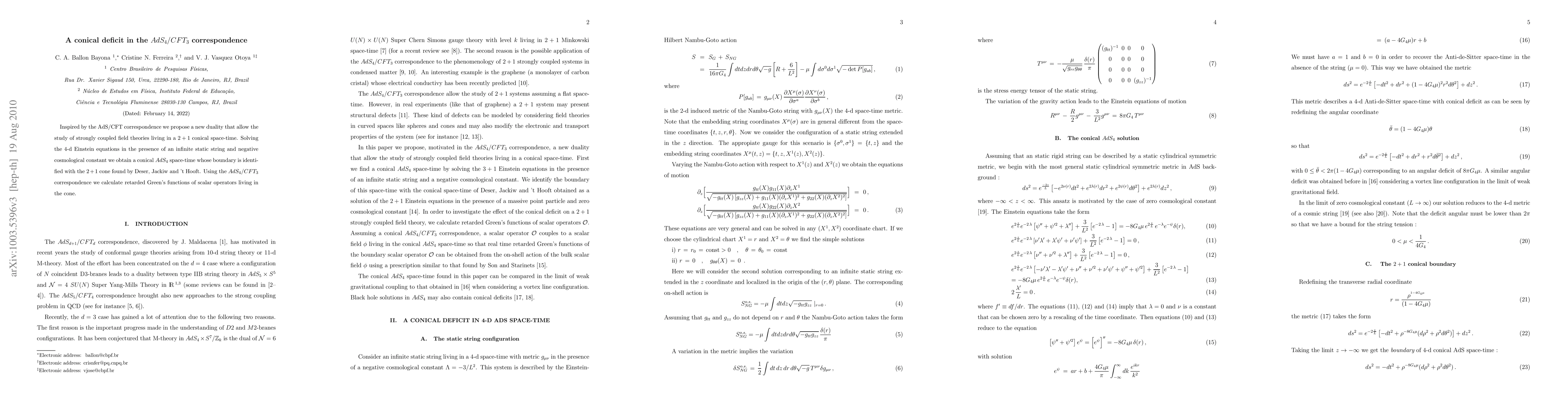 This paper proposes a new duality in the AdS/CFT correspondence to study strongly coupled 2+1 dimensional field theories via a conical AdS4 spacetime. It calculates retarded Green's functions of scalar operators using the AdS4/CFT3 correspondence.