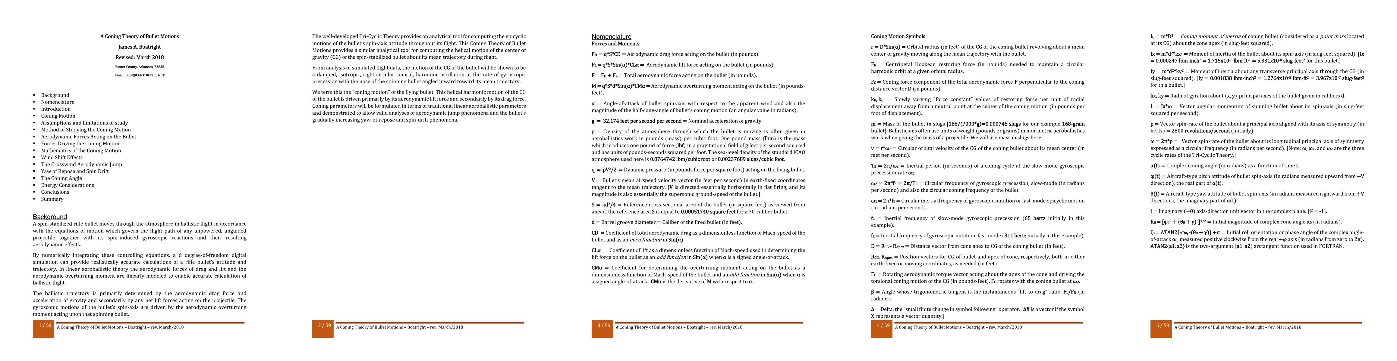 Coning Theory elucidates the motion of spin-stabilized rifle bullets through the interplay of gravity and aerodynamic forces, explaining phenomena like gyroscopic precession and the orbiting center of gravity. It introduces new equations for the orbital motion driven by lift and drag, alongside the uniform circular precession of the spin-axis.