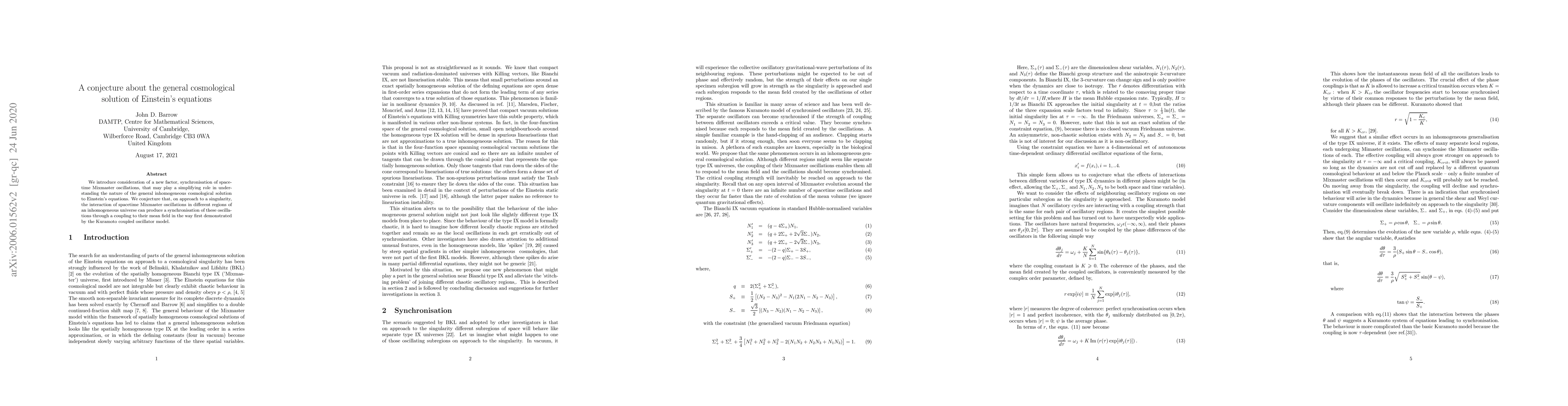 We introduce consideration of a new factor, synchronisation of spacetime Mixmaster oscillations, that may play a simplifying role in understanding the nature of the general inhomogeneous cosmological solution to Einstein's equations. We conjecture that, on approach to a singularity, the interaction of spacetime Mixmaster oscillations in different regions of an inhomogeneous universe can produce a synchronisation of these oscillations through a coupling to their mean field in the way first demonstrated by the Kuramoto coupled oscillator model.