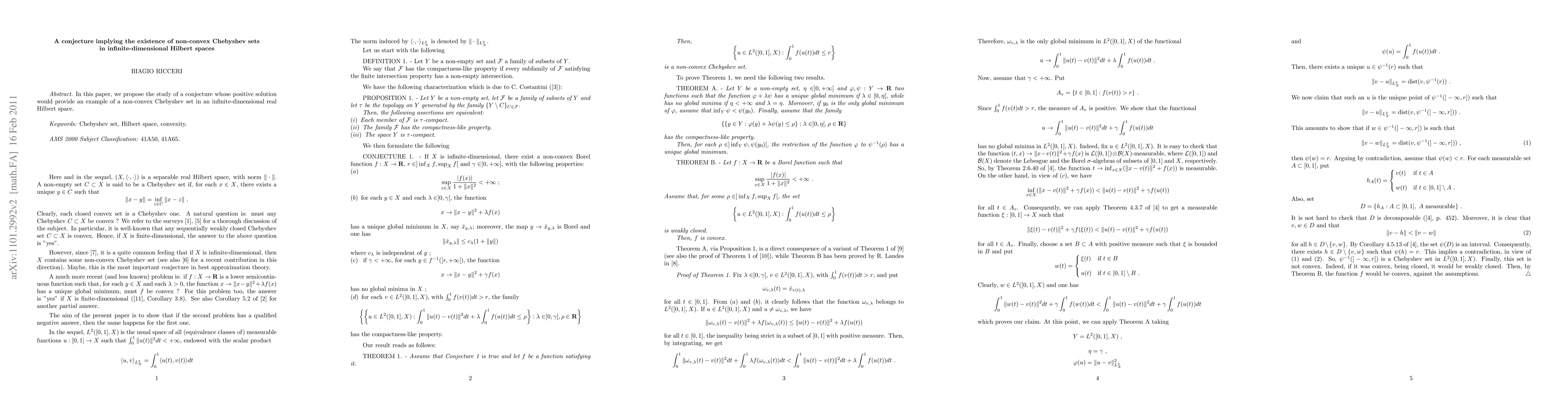 In this paper, we propose the study of a conjecture whose affirmative solution would provide an example of a non-convex Chebyshev set in an infinite-dimensional real Hilbert space.