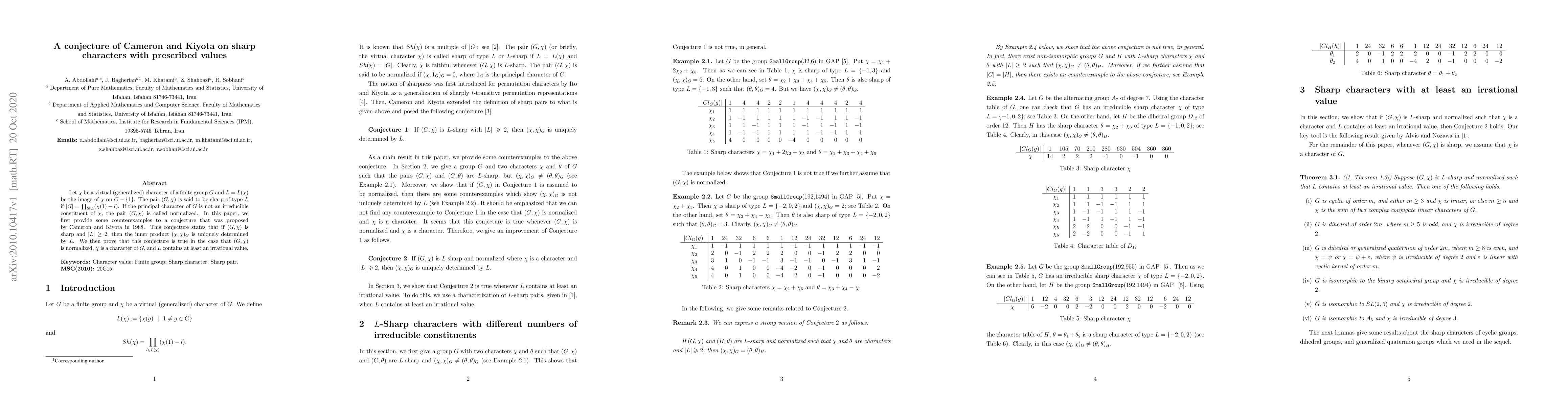 Let $ \chi $ be a virtual (generalized) character of a finite group $ G $ and $ L=L(\chi)$ be the image of $ \chi $ on $ G-\lbrace 1 \rbrace $. The pair $ (G, \chi) $ is said to be sharp of type $ L $ if $|G|=\prod _{ l \in L} (\chi(1) - l) $. If the principal character of $G$ is not an irreducible constituent of $\chi$, the pair $(G,\chi)$ is called normalized. In this paper, we first provide some counterexamples to a conjecture that was proposed by Cameron and Kiyota in $1988$. This conjecture states that if $(G,\chi)$ is sharp and $|L|\geq 2$, then the inner product $(\chi,\chi)_G$ is uniquely determined by $ L $. We then prove that this conjecture is true in the case that $(G,\chi) $ is normalized, $\chi$ is a character of $ G $, and $ L $ contains at least an irrational value.