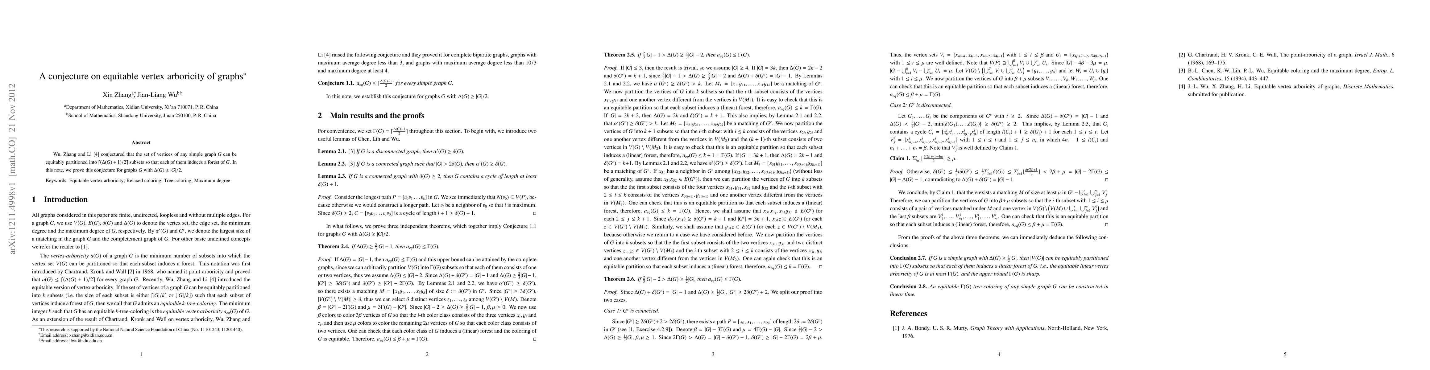 Wu, Zhang and Li [4] conjectured that the set of vertices of any simple graph $G$ can be equitably partitioned into $\lceil(\Delta(G)+1)/2\rceil$ subsets so that each of them induces a forest of $G$. In this note, we prove this conjecture for graphs $G$ with $\Delta(G)\geq |G|/2$.