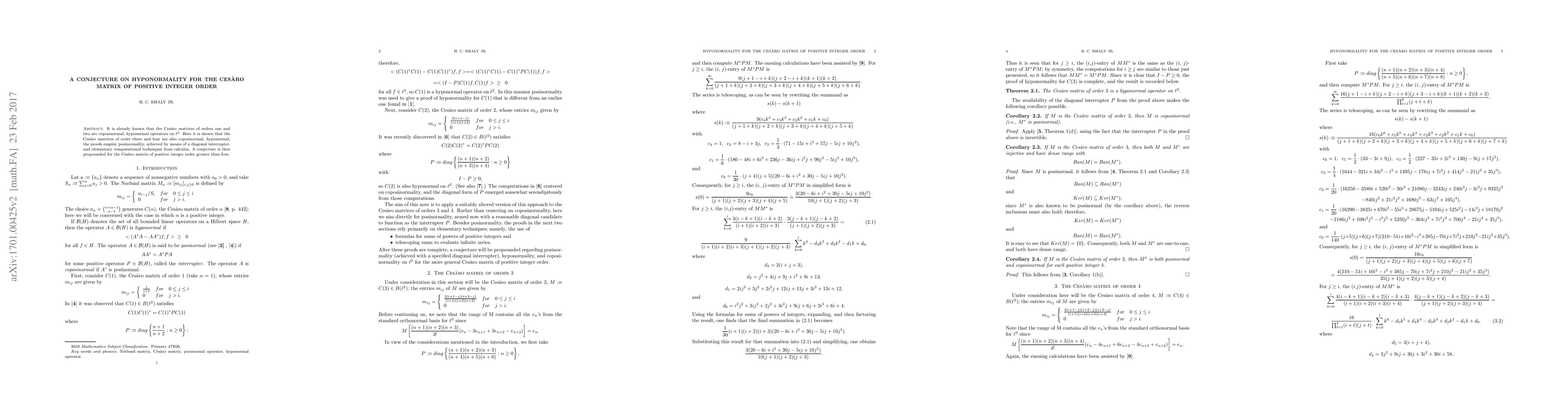 It is already known that the Ces\`{a}ro matrices of orders one and two are coposinormal, hyponormal operators on $\ell^2$. Here it is shown that the Ces\`{a}ro matrices of order three and four are also coposinormal, hyponormal; the proofs employ posinormality, achieved by means of a diagonal interrupter, and elementary computational techniques from calculus. A conjecture is then propounded for the Ces\`{a}ro matrix of positive integer order greater than four.