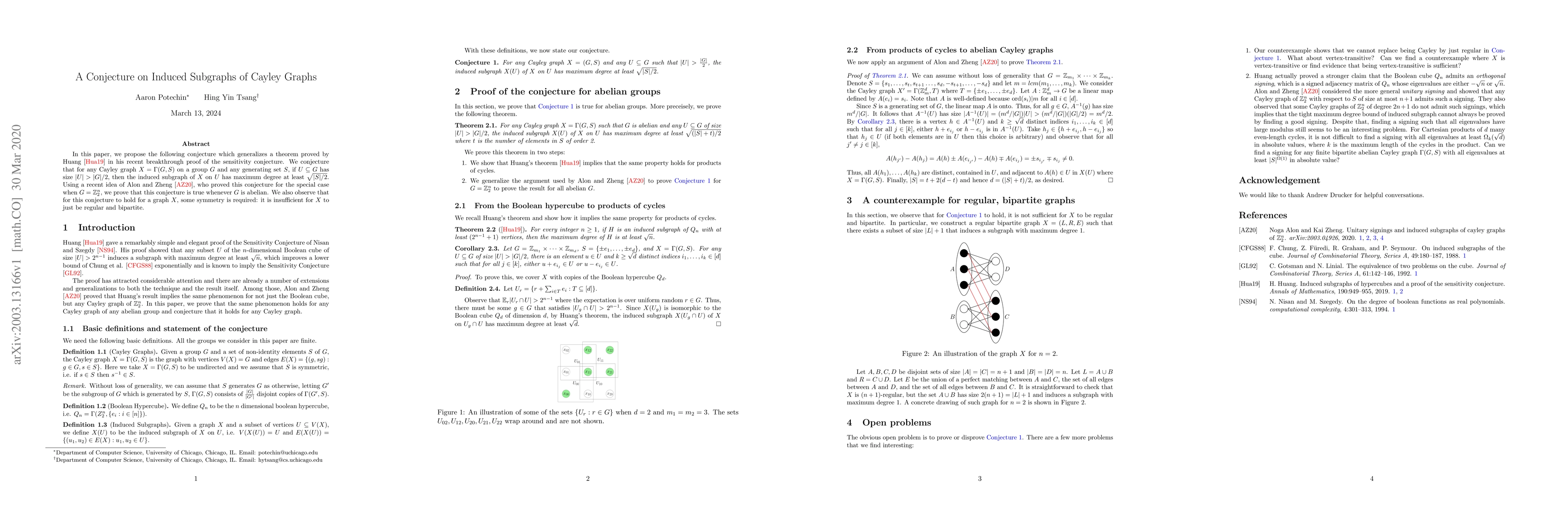 In this paper, we propose the following conjecture which generalizes a theorem proved by Huang [Hua19] in his recent breakthrough proof of the sensitivity conjecture. We conjecture that for any Cayley graph $X = \Gamma(G,S)$ on a group $G$ and any generating set $S$, if $U \subseteq G$ has size $|U| > |G|/2$, then the induced subgraph of $X$ on $U$ has maximum degree at least $\sqrt{|S|/2}$. Using a recent idea of Alon and Zheng [AZ20], who proved this conjecture for the special case when $G = Z_2^n$, we prove that this conjecture is true whenever $G$ is abelian. We also observe that for this conjecture to hold for a graph $X$, some symmetry is required: it is insufficient for $X$ to just be regular and bipartite.
