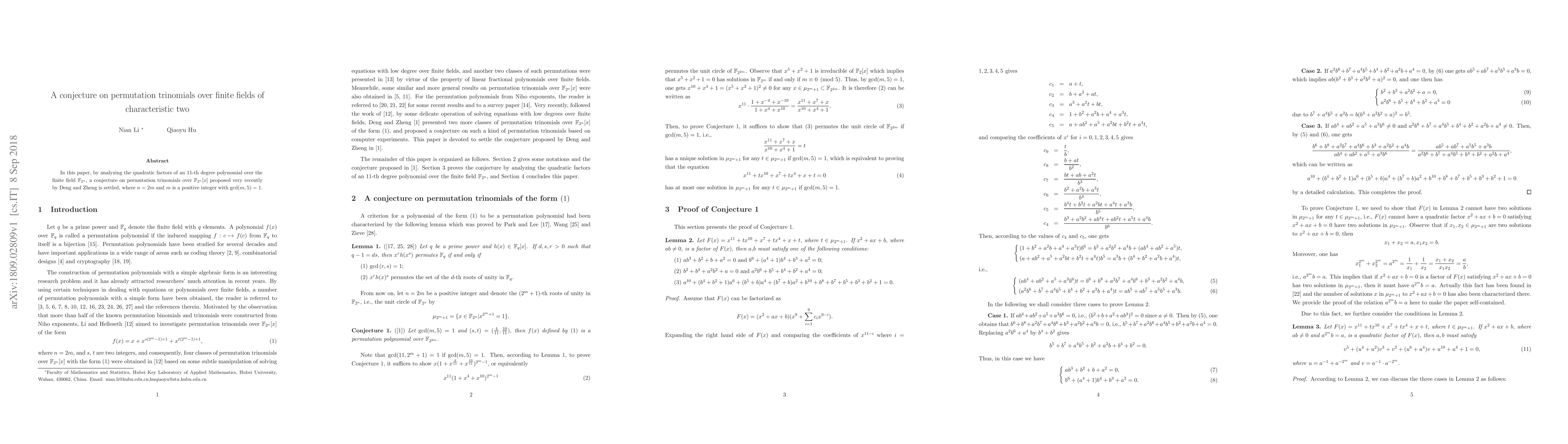 The paper presents a detailed analysis of the quadratic factors of an 11th-degree polynomial over F_2, leading to the proof of a conjecture on permutation trinomials over F_2[x].