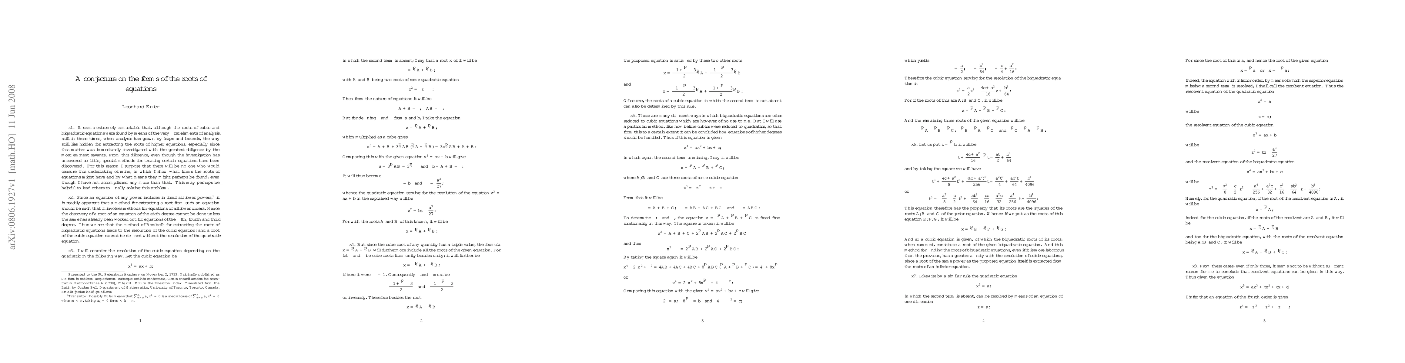 E30 in the Enestrom index. Translated from the Latin original "De formis radicum aequationum cuiusque ordinis coniectatio" (1733). For an equation of degree n, Euler wants to define a "resolvent equation" of degree n-1 whose roots are related to the roots of the original equation. Thus by solving the resolvent we can solve the original equation. In sections 2 to 7 he works this out for quadratic, cubic and biquadratic equations. Apparently he gives a new method for solving the quartic in section 5. Then in section 8 Euler says that he wants to try the same approach for solving the quintic equation and general nth degree equations. In the rest of the paper Euler tries to figure out in what cases resolvents will work. Two references I found useful were Chapter 14, p.p. 106-113 of C. Edward Sandifer, "The Early Mathematics of Leonhard Euler", published 2007 by The Mathematical Association of America and Olaf Neumann, "Cyclotomy: from Euler through Vandermonde to Gauss", p.p. 323-362 in the collection "Leonhard Euler: Life, Work and Legacy" edited by Bradley and Sandifer, 2007. Stacy Langton has given a lot of details about Euler's work on the theory of equations, and also some advice on the translation; of course any mistakes are my own. If Langton ends up writing anything about Euler' and the theory of equations I would highly recommend reading it.